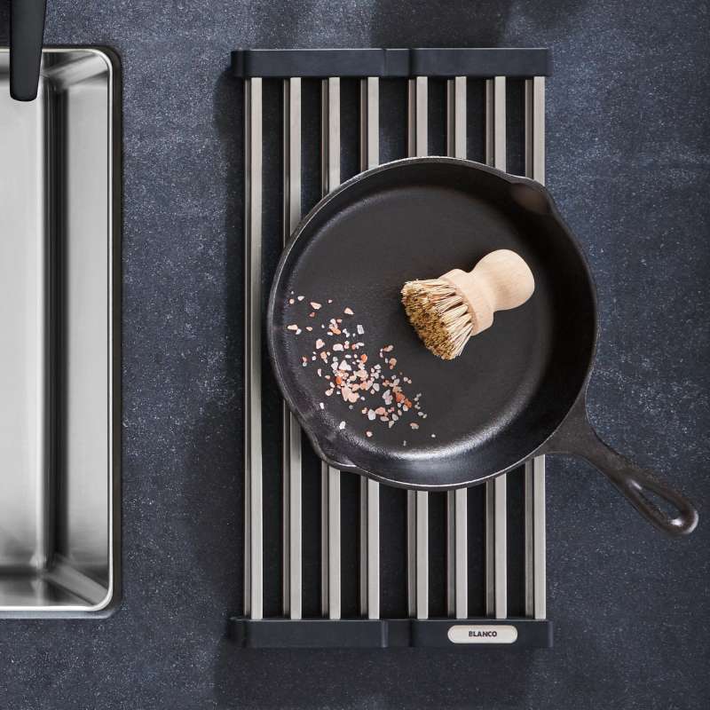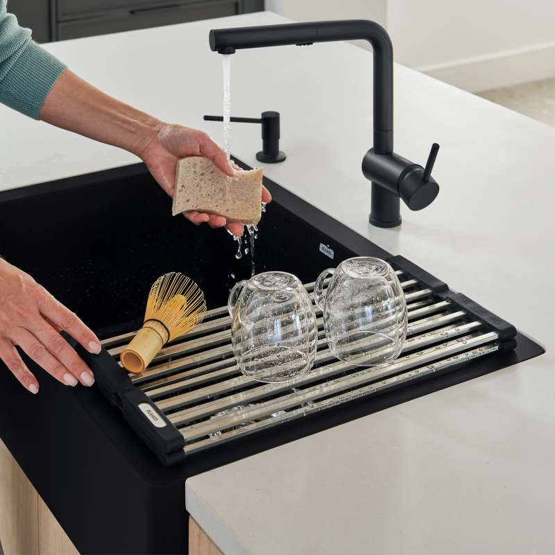 It is often the clever accessories that make everyday kitchen tasks so much more convenient and efficient. BLANCO's new foldable grid is just that; a multi-purpose sink accessory designed to maximize your workspace above the sink bowl. This versatile sink accessory can be used for drying dishes, rinsing produce, or filling your pots without bending over. It can also be used as a trivet for added heat protection for your countertops. When it is not in use, simply roll up the grid and stow at the edge of your sink or easily store in your cabinet or drawer. The options are limitless, making it an indispensable tool in your kitchen.