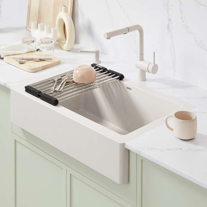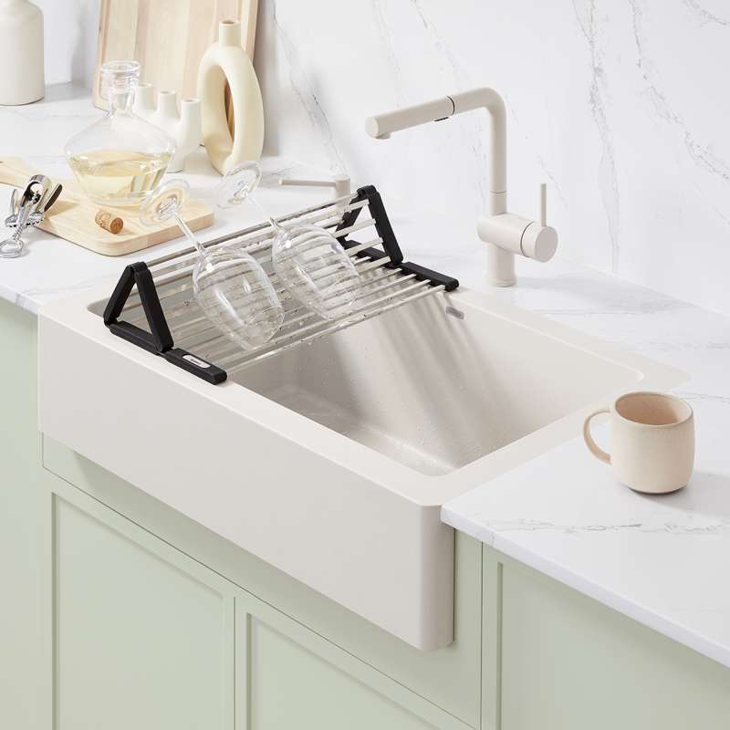• Multi-functional sink accessory designed for drying dishes, rinsing produce, filling pots, or as a trivet