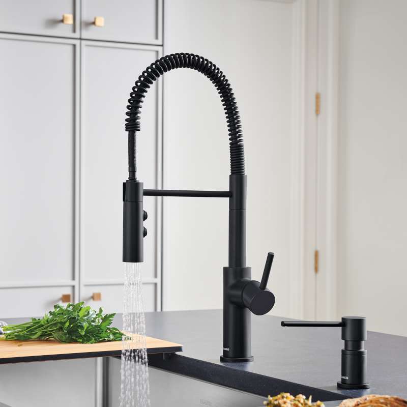 The CATRIS offers a fresh take on the semi-professional faucet, combining functional elements and modern industrial flair. Designed to make cooking and cleaning more efficient than ever before, the CATRIS boasts a 360-degree swivel for extended range of motion and a dual spray function to tackle everyday tasks from rinsing dishes to power washing dirty pots and pans. Its patented aerator significantly reduces limescale buildup, while its flexible, spring pull-down hose provides a sleek, industrial look. The CATRIS is built to deliver high performance for many years while providing long-lasting convenience. Easily pair your CATRIS with your favorite BLANCO sink and accessories for a fully integrated BLANCO UNIT. With this setup, you'll have everything you need to drink, prep and clean all in one place.