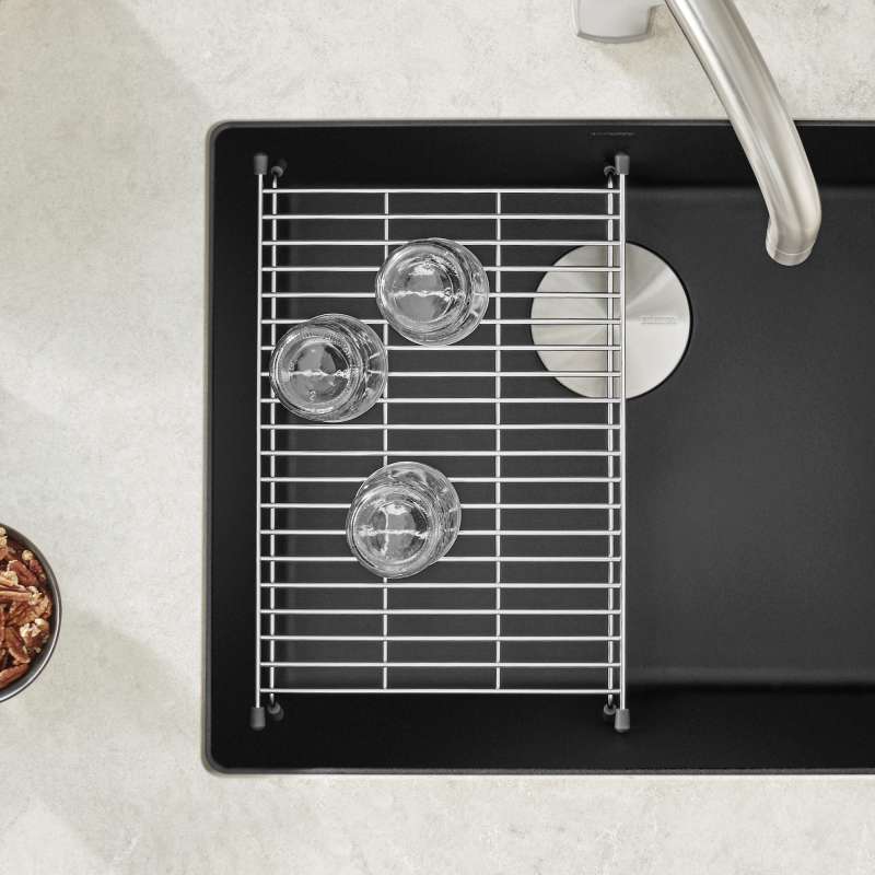 The BLANCO PRECIS FLOATING SINK GRID is a patented design which gently floats 5" above the sink bottom, and can be used as a second sink level for cleaning and prepping. It is strong enough to hold the weight of heavy pots and pans, making using your BLANCO sink that much easier. The grid can also be used as a countertop trivet for hot pots and pans. Add functionality and beauty to your kitchen with our high-quality floating grids.
