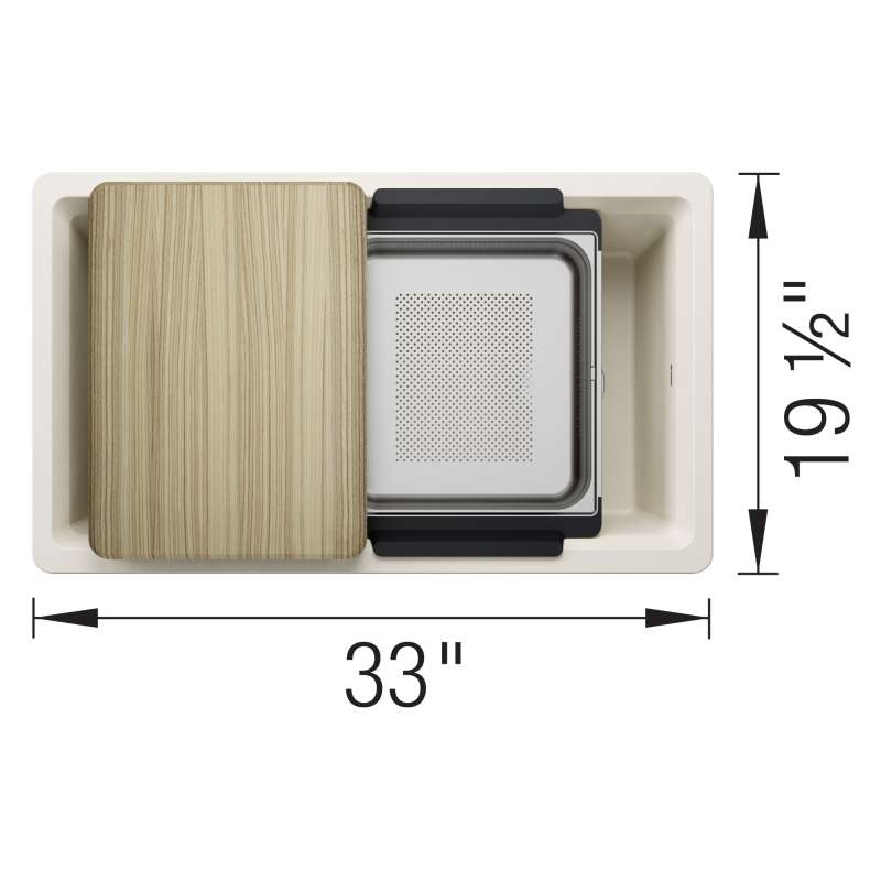The INTEOS 33 workstation sink simplifies your workflow while keeping you organized. Adaptable accessories go beyond basic meal prep while the Stack & Store system allows you to neatly stack accessories or store them below the sink. INTEOS workstations come with a wood cutting board, large colander and accessory holder that conveniently slide along the sink's angled edge. Enhance meal prep with optional INTEOS accessories, including small colanders and oven-safe small and large trays. Serve stunning food spreads from your sink for a gourmet gathering. Streamline clean-up with the INTEOS dish rack, protective sink grid and storage bag. The INTEOS 33 offers a generous 9" bowl depth and fits into a 36" minimum cabinet size. Made of BLANCO's patented SILGRANIT(R) composite material, INTEOS sinks are engineered to withstand heavy cookware and hot bakeware in a range of nature-inspired colors. Combine with a BLANCO faucet, filtration and more to create a BLANCO UNIT; a seamless, fully-integrated kitchen solution.