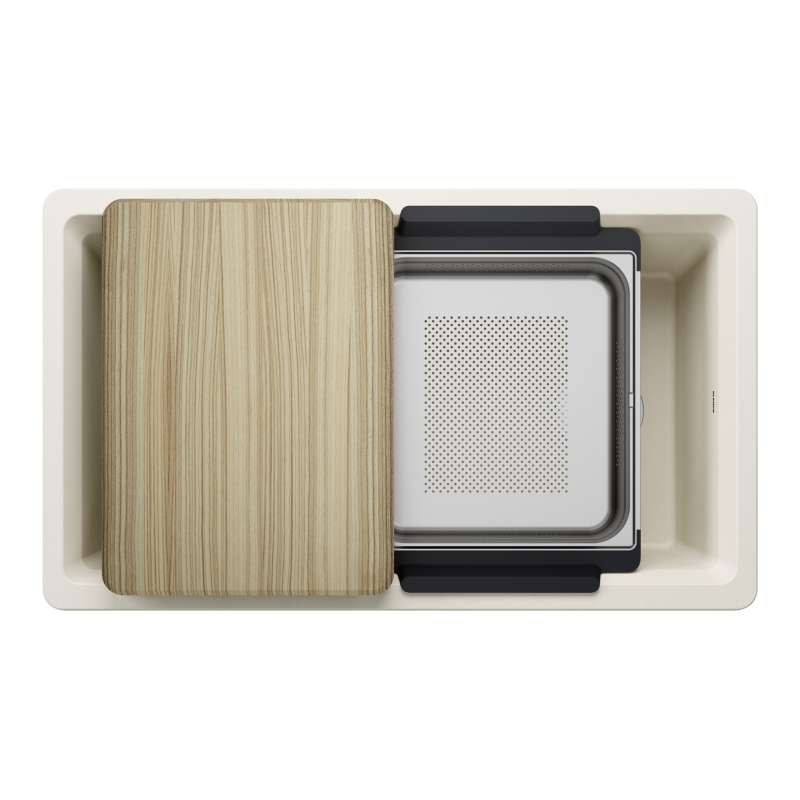 • Included INTEOS workstation sink accessories: Wood Cutting Board, Large Colander and Accessory Holder