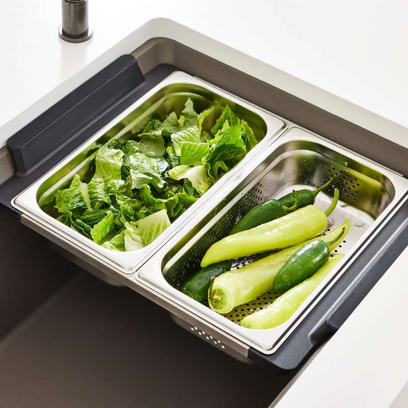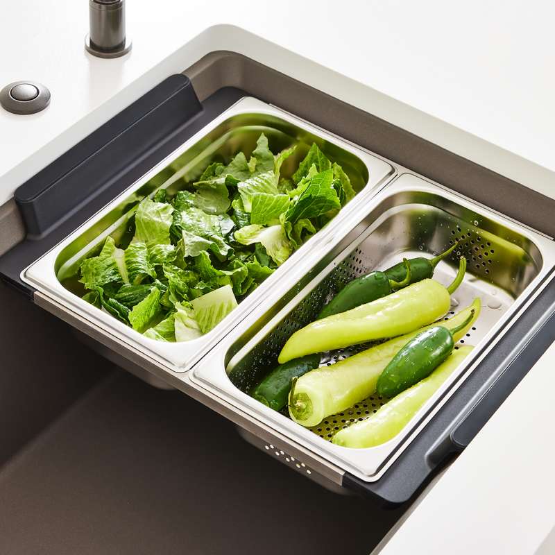 INTEOS workstation sinks simplify meal prep thanks to the INTEOS Small Colander. The small colander is designed to fit all BLANCO INTEOS workstation sinks within the INTEOS accessory holder. The accessory holder fits two small colanders side by side for double rinsing duty. This multi-purpose tool is perfect for straining pasta, rinsing produce and can easily slide along the sink's angled edge. Easily stack underneath the cutting board or store neatly in the INTEOS Storage Organizer Bag. Combine the large tray and soak beans or nuts beautifully. Experience culinary bliss. Do more with INTEOS.