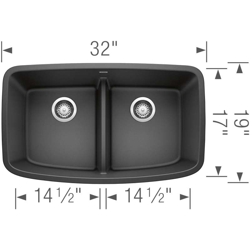 • Valea SILGRANIT 32" 50/50 Double Bowl Undermount Kitchen Sink with Low Divide - Coal Black, 442940 Coal Black