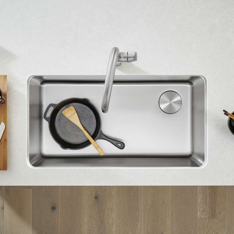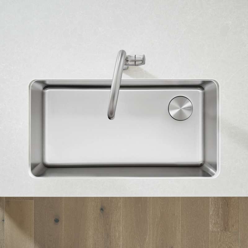 Contemporary form for everyday needs. The FORMERA 33" Single Bowl Undermount Stainless Steel Kitchen Sink is ideal for busy kitchens thanks to its spacious single bowl configuration that allows for easy washing of large pots and pans. German-engineered with corrosion-resistant stainless steel for long-lasting durability and 30 mm radius corners for low-maintenance cleaning -the FORMERA 33" sink makes kitchen life easy. Combine the FORMERA 33" sink with a BLANCO faucet and accessories to create a BLANCO UNIT; a seamless, fully-integrated kitchen solution designed to transform kitchen chores into joyful experiences. Everything you need to drink, prep and clean, all in one place.