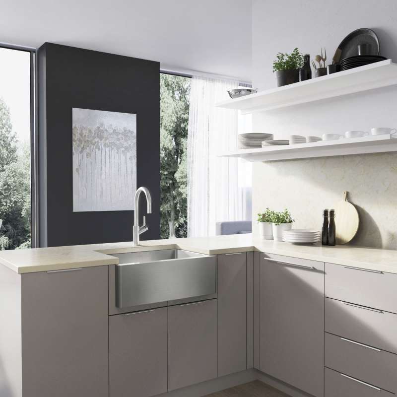 You asked for it, we delivered. Discover the definition of beautiful, contemporary style. Everything in your home speaks to your modern style. And your sink should be no exception. But aspiring for high design doesn't have to equal lots of extra work. Our versatile QUATRUS R15 25 inch STAINLESS STEEL APRON FRONT KITCHEN SINK is crafted with softer radius corners, maintaining its beauty, yet adding an element of effortlessness. Its generous corners offer an easier-to-clean surface so that you can spend more time enjoying and less time cleaning. With premium 18-gauge stainless steel plus custom accessories like colanders, grids and cutting boards, the QUATRUS feels as much at home during its close-up prepping dinner for guests as it does being admired longingly from across the room.