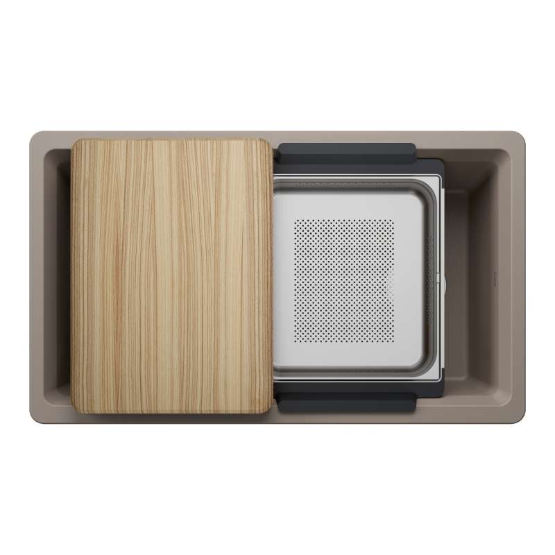 - Included INTEOS workstation sink accessories: Wood Cutting Board, Large Colander and Accessory Holder