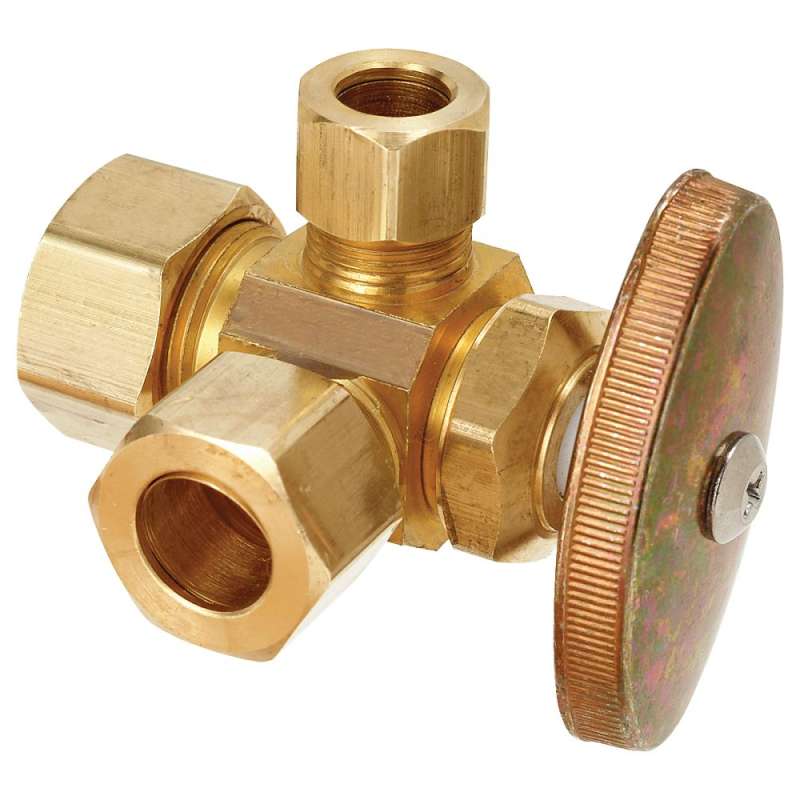 - 1/2 in. Nom Comp Inlet x 1/2 in. OD Comp x 3/8 in. OD Comp Dual Outlet Multi-Turn Stop