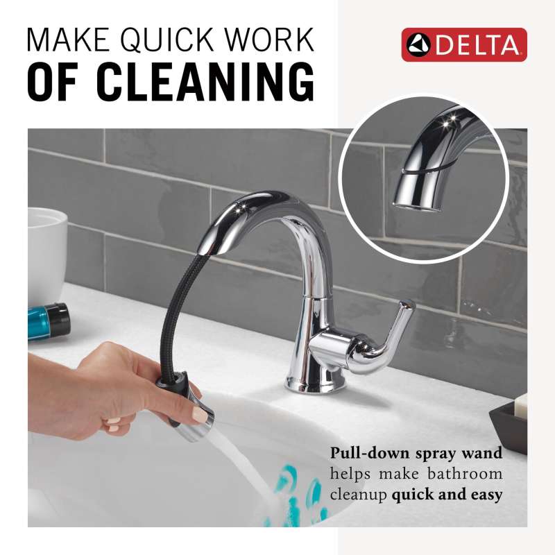 The stretched feminine form and unbroken lines of the kayra bath collection create a clean, flowing design with an integrated pull-down spray wand that simplifies cleanup. Delta watersense labeled faucets use at least 20% less water than the industry standard—saving you money without compromising performance. You can install with confidence, knowing that delta faucets are backed by our lifetime limited warranty.