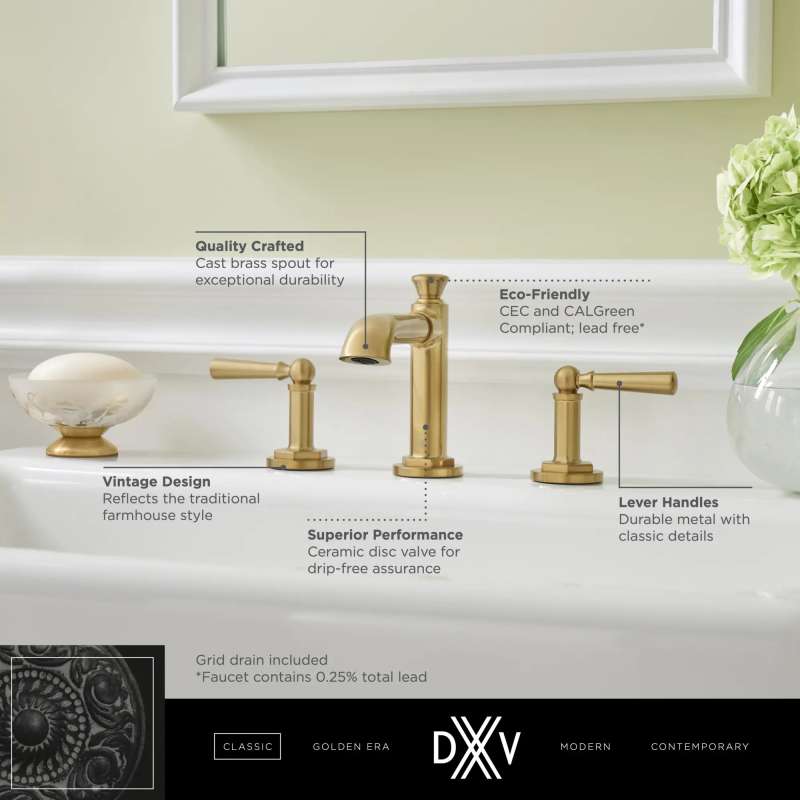 The Oak Hill Widespread Faucet from DXV brings the charm and lasting appeal of the traditional farmhouse aesthetic into today’s home. Designed to preserve the authenticity and spirit of the period, the Oak Hill Faucet reflects the simple, stoic character that balances utility and beauty in statement-making style. The Oak Hill Faucet is part of the Oak Hill Collection, a complete, curated bathroom suite for the well-appointed home. Available in four beautiful finishes.