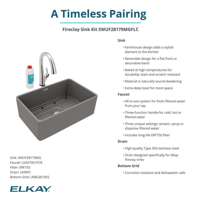 - KIT INCLUDES: SWUF28179MG sink, LKAV7051FCR faucet with filter included, LKBG2616SS bottom grid, LK99FC drain; conveniently packaged together to save you time