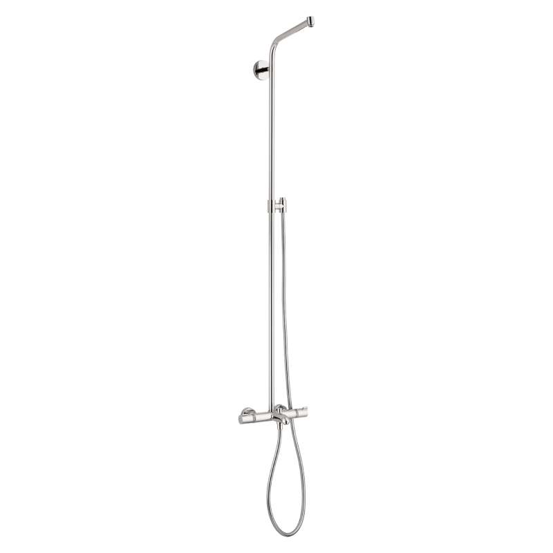 The hansgrohe Crometta E EcoSmart shower system is the clever solution for simple bathroom modernization. It is connected to an existing rough-in or a water connection on the wall (e.g. hansgrohe FixFit) with a second shower hose. The overhead or hand shower (sold separately) can then be selected at the push of a button using the hansgrohe Select button. The water volume and temperature are controlled separately via an existing fitting. Saving water made easy: thanks to hansgrohe EcoSmart technology, this shower reduces water consumption by up to 40%. Requires showerpipe rough-in basic set No. 16181181 for installation.