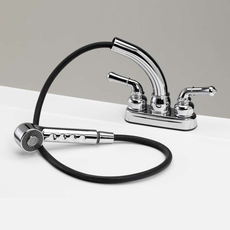 - Includes: One-piece molded tub of impact-resistant polypropylene with heavy gauge steel legs, with adjustable levelers, swivel faucet with 24" long pull-out spout and lever handles, 1-1/2" P-Trap with 12" tailpiece, two 20" flexible braided supply lines and a drain stopper