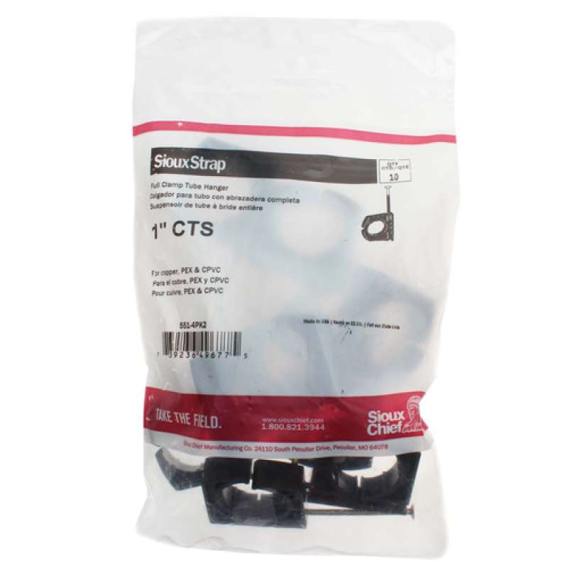 Sioux Chief Tube Hanger is used where necessary to secure 1" CTS supply lines in residential or commercial applications. Clamp shall be 100 percent corrosion proof and UV resistant. Clamp shall be impact resistant to 0 degrees F and be able to withstand continuous temperatures up to 160 degrees F. Clamp shall include preloaded, continuous ring shank, zinc-plated nail to resist rust. Clamp shall be designed to protect tube from damage if nail is overdriven. Clamp shall be compatible with CTS copper, PEX or CPVC tube.