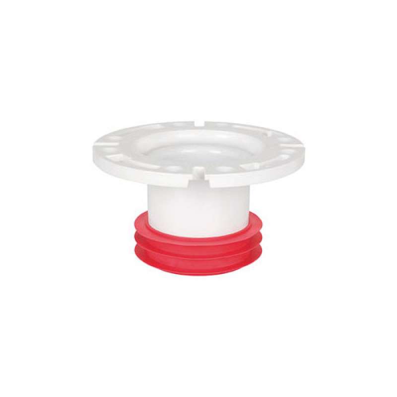 Sioux Chief 886 series Push-Tite closet flange. Flange ring have sufficient holes for securing to floor and optional notches or slots for inserting closet bolts. Flange throat is at least 3" in diameter and have smooth inner walls with no obstructions or ledges to provide full/spherical flow and clog resistance. Engineered elastomer flange gasket have 3 points of contact to ensure a positive seal inside any 4" nominal DWV piping.