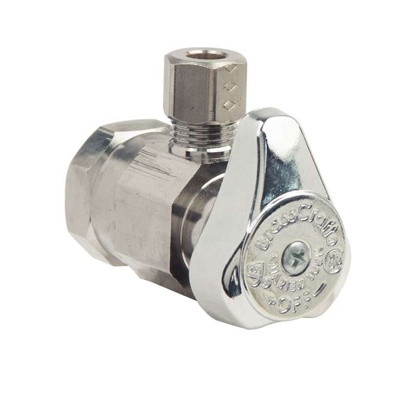 BrassCraft 1/2 in. FIP Inlet x 1/4 in. OD Compression Outlet 1/4-Turn Angle Valve controls water flow to household plumbing fixtures