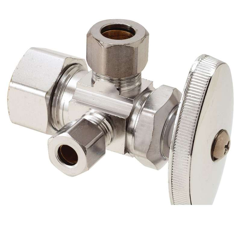 - 1/2 in. Nom Comp Inlet x 3/8 in. OD Comp x 1/4 in. OD Comp Dual Outlet Dual Shut-Off Multi-Turn Angle Stop