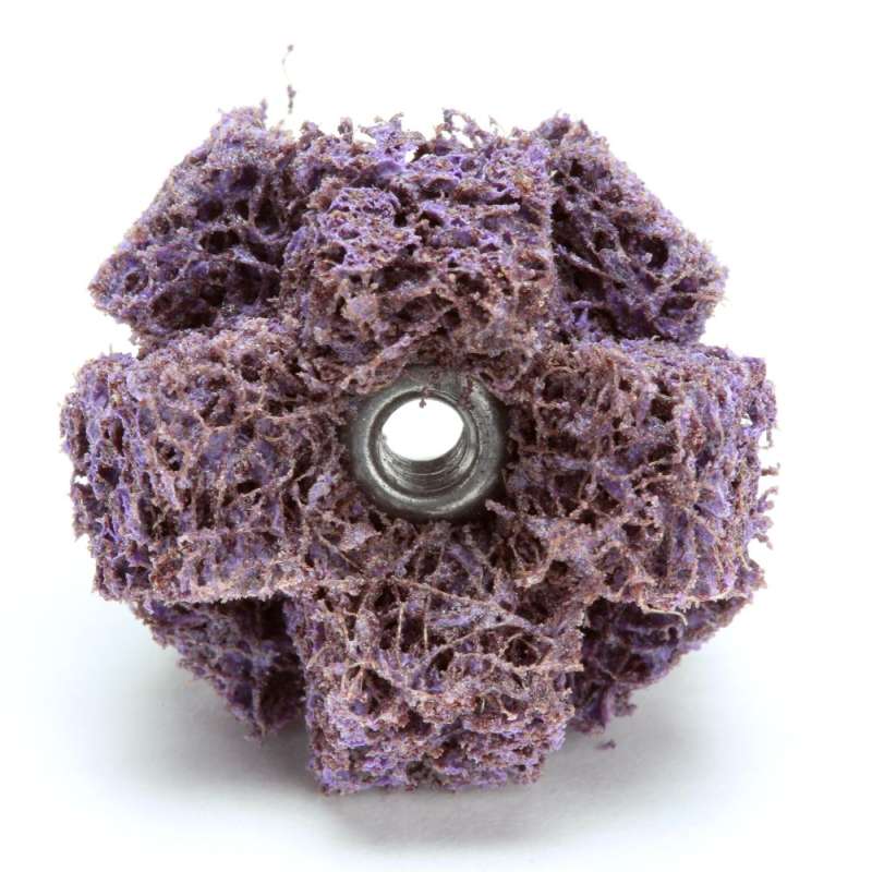Scotch-Brite™ Cross Buff polishes, cleans, satin finishes, denibs and defuzzes the interior diameters of metal components, such as lifter bores, valve bodies, valve spools, and tubing. Conformability of the nylon web makes this abrasive useful for removing surface oxidation, rust and corrosion on dies and molds prior to coating and polishing. The 2-ply staggered design gives you consistent results, even in hard-to-reach locations, unique profiles, and interior contours. Scotch-Brite™ Cross Buffs are commonly used in aerospace, automotive and other industrial markets. The purple cleaning and polishing tool uses an aluminum oxide abrasive capable of producing a high luster finish. Aluminum oxide is a popular choice among industrial professionals because of its cut-rate and long life. This mineral is a tough, durable abrasive that self-fractures to expose fresh cutting edges in use, whereas traditional abrasives, such as garnet, quickly wear down with use. Due to its high cut-rate, hardness, strength, and low heat retention, aluminum oxide mineral is widely used in grinding applications in addition to sanding and finishing use. Aluminum oxide is suitable on a wide variety of substrates in both woodworking and metalworking, including ferrous alloys. Scotch-Brite™ is a unique surface conditioning product with abrasives incorporated into non-woven fibers. Combining abrasives into the fibers creates an abrasive system that gives you consistent results for the life of the product. The open-web material is load resistant and keeps the abrasive minerals cutting at high performance by limiting clogging of the fibers.