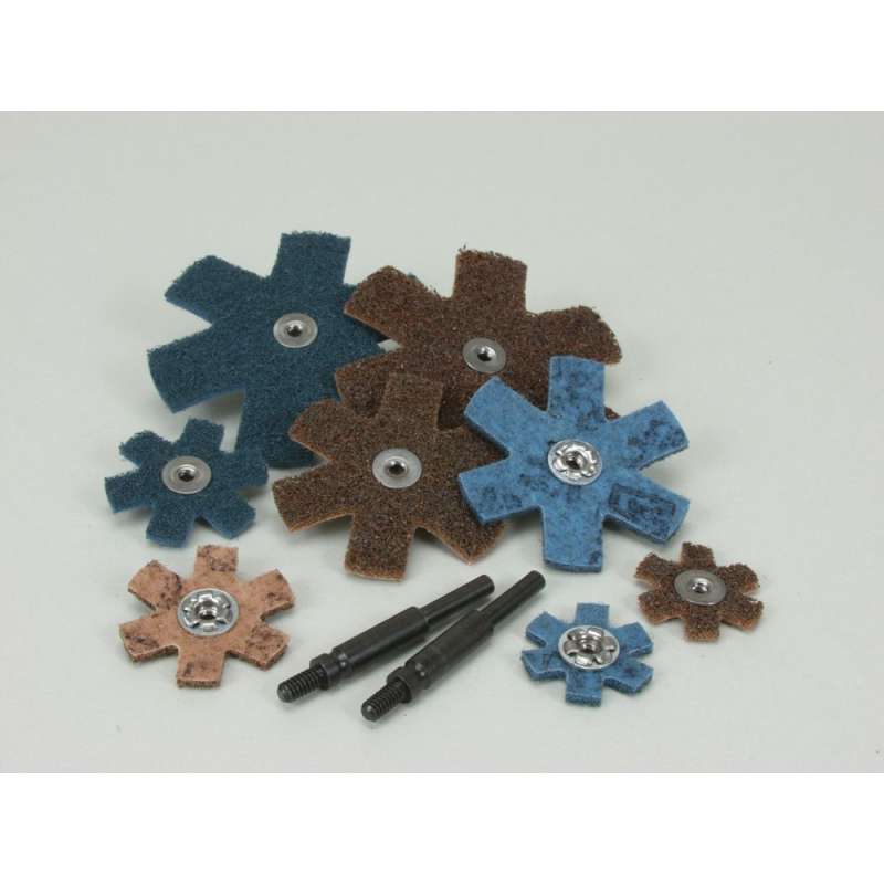 Scotch-Brite™ Star was designed for blending, deburring and finishing hard-to-reach internal diameters, including metal tubing and piping. Tackle Hard-To-Reach Areas Scotch-Brite™ Star has six spindles attached to an eyelet. Made with nonwoven technology, the spindles are spongy, buoyant and flexible. Consequently, they can bend and move to accommodate the insides of metal tubes and pipes. Scotch-Brite™ Star comes in small sizes, with the smallest diameter being 1-1/2 inches and the largest diameter being 4 inches. The small size supplements the spongy spindles, helping the abrasive fit inside hard-to-reach areas. These stars lightly deburr and blend contours and ridges without gouging or marring the surface, helping to reduce scraps and rework. Stars may be used on a variety of metals: stainless steel, aluminum, carbon steel, cast iron, titanium and non-ferrous metals. Ease of Use The Scotch-Brite™ Star may be used with 3M mandrel 944 (sold separately).The threaded attachments fasten to mandrel 944 for safe use on a die grinder. Scotch-Brite™ Star requires low pressure when used at correct operating speeds. [Reviewer please confirm].The abrasive is available in coarse (CRS) and very fine (VFN) grades. Use a coarse abrasive when refining a deep grind line/scratch or when a more aggressive scratch pattern is desired, and use a fine abrasive when a soft, fine scratch pattern is desired. Scotch-Brite™ Star comes in packs of 50 or 100 stars per case to minimize the need for ordering replacements and to help reduce operating costs. The Many Benefits of Open Web Abrasives Nonwoven technology makes our Scotch-Brite™ industrial abrasives unique. A combination of fiber strands, resin, and abrasive mineral forms a thick, open web. The spring-like nature of the fibers responds to contours and effectively removes unwanted burrs, soils, and contaminants while maintaining the geometry of the workpiece, which in turn reduces rework and boosts productivity. Gaps in the web allow swarf to escape, so debris does not clog the mineral. Fibers in the web continually break down with use to reveal fresh mineral for exceptional consistency, superior cut performance, and extremely long service life. Scotch-Brite products not only enhance productivity, but also increase operator safety. By reducing the need for cleaning chemicals and pastes, and replacing wire brushes that can break off and cause injury. From aesthetic finishing to deburring and more, Scotch-Brite abrasives work fast and deliver consistent results, part after part.