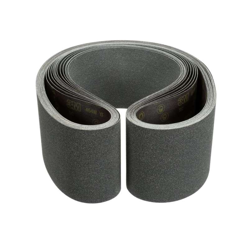 3M™ Cloth Belt 464W is an abrasive sanding belt constructed on a heavy, YF-weight backing that features closed coat construction for aggressive sanding action. The silicon carbide abrasive, Cork Particles and flexible backing make this cloth an ideal product for metal surface sanding and final cosmetic polish, including the required "blue" finish on stainless steel. Tough Sanding and Finishing Belt 3M™ Cloth Belt 464W is best suited for metal sanding and finishing thanks to its durability and fast cutting abrasive material. Its heavy, polyester cloth backing provides smooth operation and durability and can conform to the shape of contoured parts for consistent finishing. The abrasive side features closed coat construction for aggressive sanding and a distinct blue-black color helps to easily differentiate it from other grits and grains. Silicon Carbide Abrasive This paper primarily uses silicon carbide, which is a popular choice among industrial professionals because of its fast cut-rate and smooth finish. This synthetic mineral is very hard and fractures easily, resulting in freshly exposed sharp edges that cut extra fast and produce a smooth, professional-looking finish. Silicon carbide products are commonly used for low-pressure applications such as cleaning and finishing on wood and metal. While it wears faster than aluminum oxide, it produces a finer finish. Waterproof and Heat Resistant This sheet also uses a resin bonding which is specially designed to resist thermal and chemical deterioration, which can occur during sanding. This bond is very tough and excellent for precision work on hard and soft surfaces. This also allows for faster sanding and a higher cut rate. The waterproof polyester backing material enables the user to rinse areas of the workpiece and the cloth during use to prevent dust and debris from clogging the points of the abrasive, while producing a faster cut at the same time.