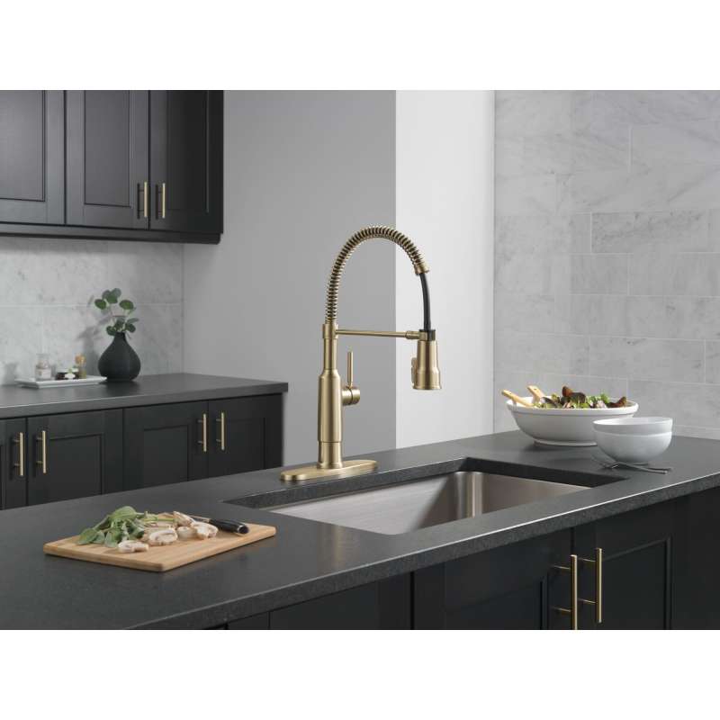 the theodora pro kitchen faucet brings a relaxed, classic look into your kitchen with new traditional elements. The spring pull-down provides ultimate flexibility, making it easy to turn, bend, stretch and reach more places. Delta magnatite docking uses a powerful integrated magnet to set your pull down sprayer precisely into place and hold it there so it stays docked when not in use. Shieldspray technology cleans with laser-like precision while containing mess and splatter. You can install with confidence, knowing that delta kitchen faucets are backed by our lifetime limited warranty