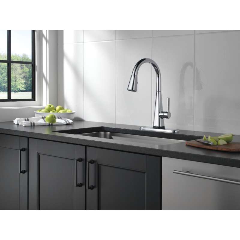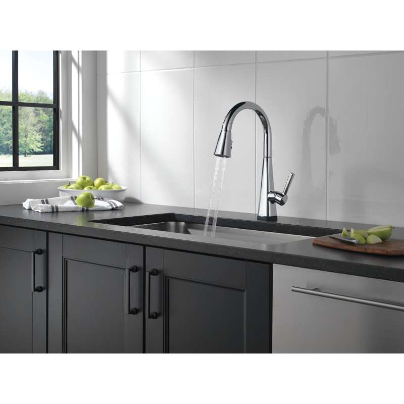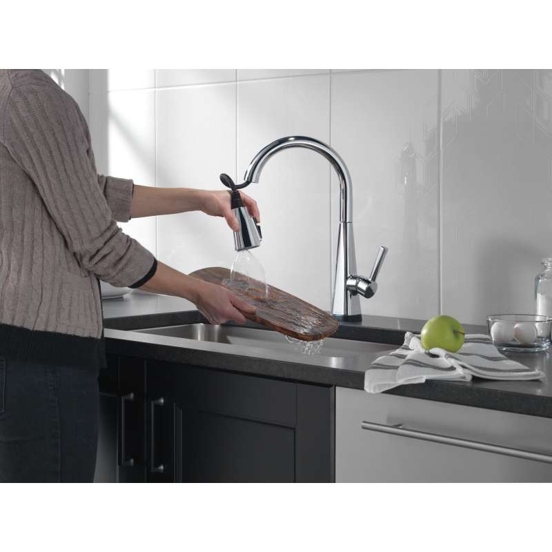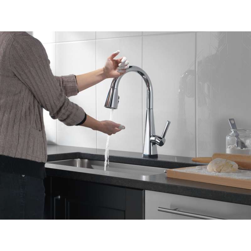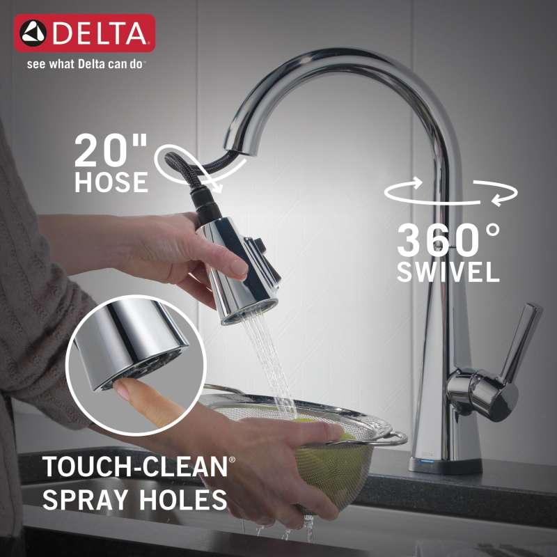 Touch it on. Touch it off. Whether you have two full hands or 10 messy fingers, delta touch2o technology helps keep your kitchen faucet clean, even when your hands aren’t. A simple touch anywhere on the spout or handle with your wrist or forearm activates the flow of water at the temperature where your handle is set. The delta tempsense led light changes color to alert you to the water’s temperature and eliminates any possible surprises or discomfort. Kitchen sink faucets with touch-clean spray holes allow you to easily wipe away calcium and lime build-up with the touch of a finger. Delta shieldspray technology cleans with laser-like precision while containing mess and splatter. A concentrated jet powers away stubborn messes while an innovative shield of water contains splatter and clears off the mess, so you can spend less time soaking, scrubbing and shirt swapping. Delta kitchen faucets with diamond seal technology perform like new for life with a patented design which reduces leak points, is less hassle to install and lasts twice as long as the industry standard. Kitchen sink faucets with touch-clean spray holes allow you to easily wipe away calcium and lime build-up with the touch of a finger. You can install with confidence, knowing that delta kitchen faucets are backed by our lifetime limited warranty. Electronic parts are backed by our 5-year electronic parts warranty. Industry standard is based on asme a112.18.1 of 500,000 cycles.