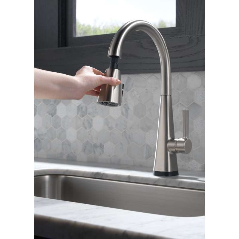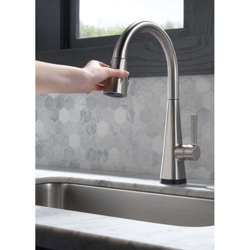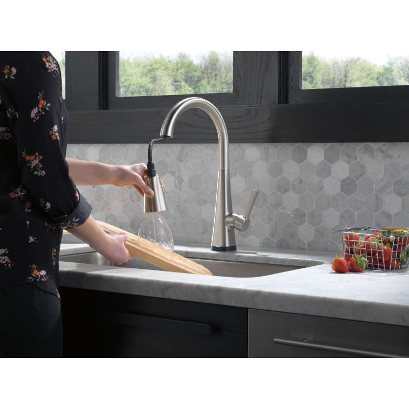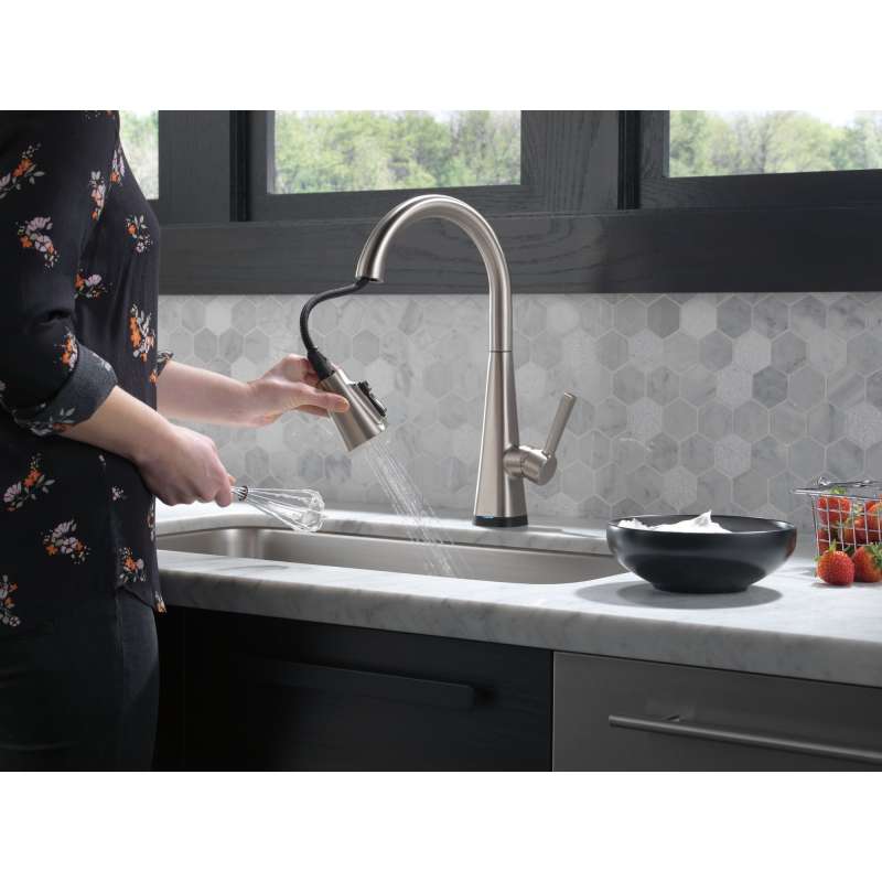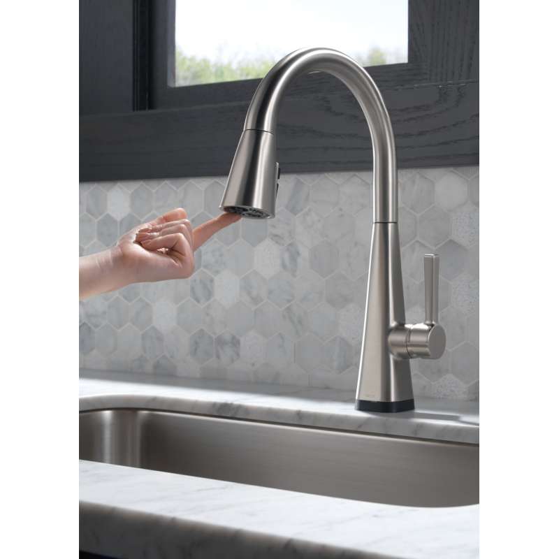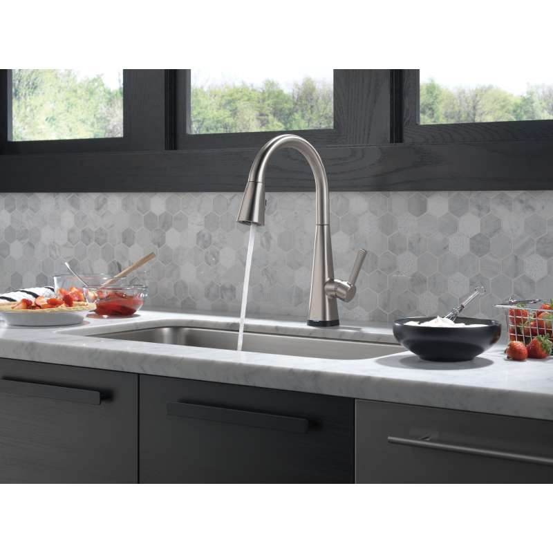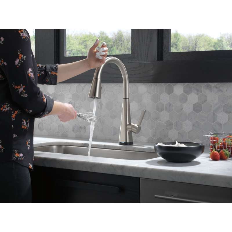 Touch it on. Touch it off. Whether you have two full hands or 10 messy fingers, delta touch2o technology helps keep your kitchen faucet clean, even when your hands aren’t. A simple touch anywhere on the spout or handle with your wrist or forearm activates the flow of water at the temperature where your handle is set. The delta tempsense led light changes color to alert you to the water’s temperature and eliminates any possible surprises or discomfort. Kitchen sink faucets with touch-clean spray holes allow you to easily wipe away calcium and lime build-up with the touch of a finger. Delta shieldspray technology cleans with laser-like precision while containing mess and splatter. A concentrated jet powers away stubborn messes while an innovative shield of water contains splatter and clears off the mess, so you can spend less time soaking, scrubbing and shirt swapping. Delta spotshield technology helps to keep your kitchen faucet cleaner, longer by resisting water spots and fingerprints. Keep your space spotless with spotshield technology, available across a variety of finishes for the kitchen and bath. Delta kitchen faucets with diamond seal technology perform like new for life with a patented design which reduces leak points, is less hassle to install and lasts twice as long as the industry standard. Kitchen sink faucets with touch-clean spray holes allow you to easily wipe away calcium and lime build-up with the touch of a finger. You can install with confidence, knowing that delta kitchen faucets are backed by our lifetime limited warranty. Electronic parts are backed by our 5-year electronic parts warranty. Industry standard is based on asme a112.18.1 of 500,000 cycles.