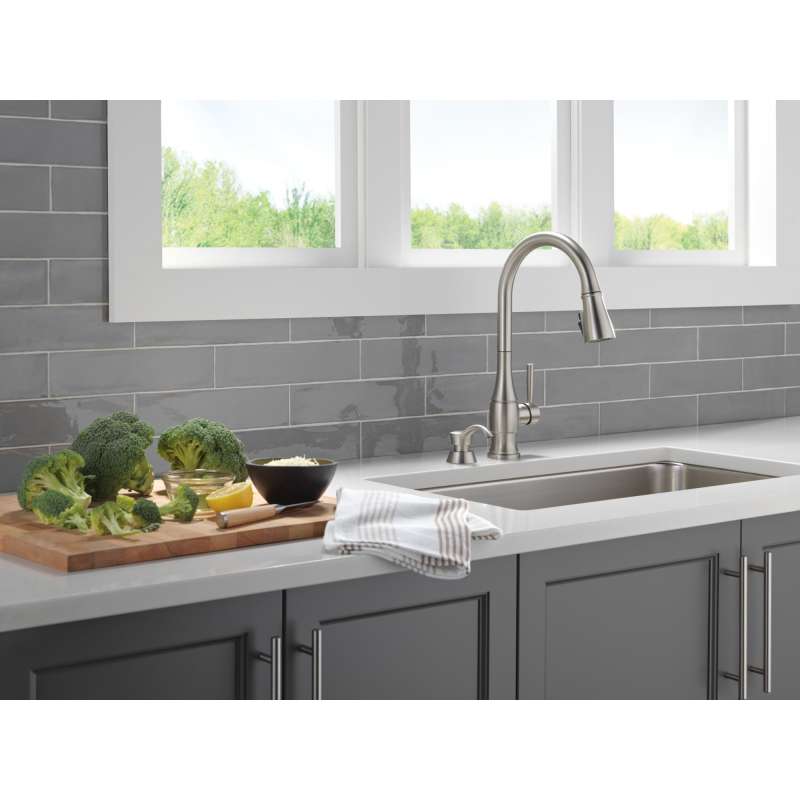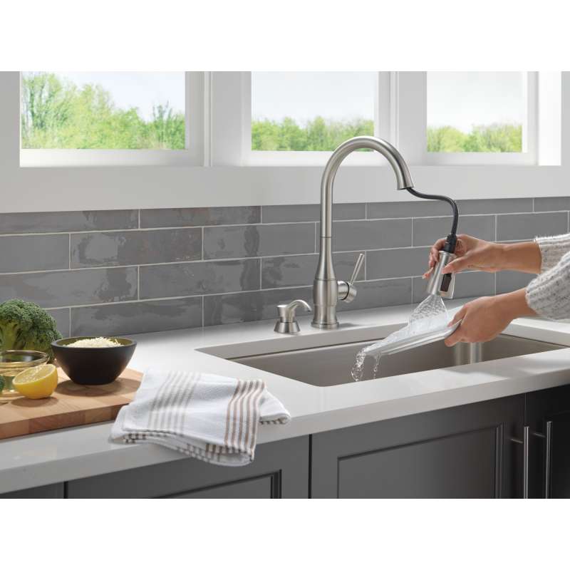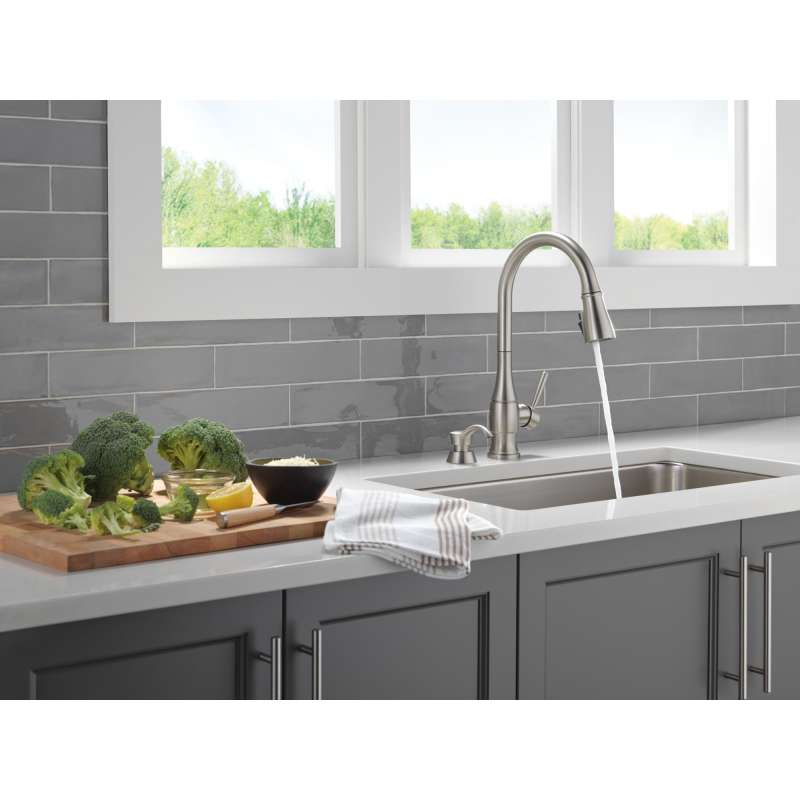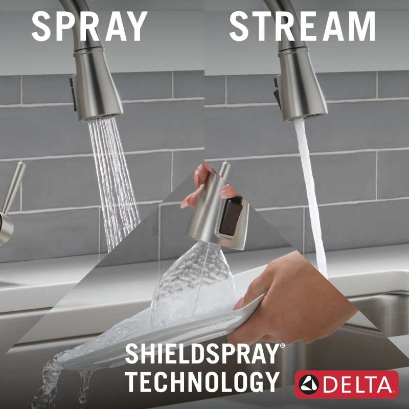 Bring delicate details and flowing lines to your kitchen with the hazelwood kitchen faucet. Magnatite docking uses a powerful integrated magnet to set your pull down sprayer precisely into place and hold it there so it stays docked when not in use. Shieldspray technology uses a concentrated jet to power away stubborn messes while an innovative shield of water contains splatter and clears off the mess, so you can spend less time soaking, scrubbing and shirt swapping. Delta kitchen faucets with diamond seal technology perform like new for life with a patented design which reduces leak points, is less hassle to install and lasts twice as long as the industry standard. You can install with confidence, knowing that delta faucets are backed by our lifetime limited warranty.