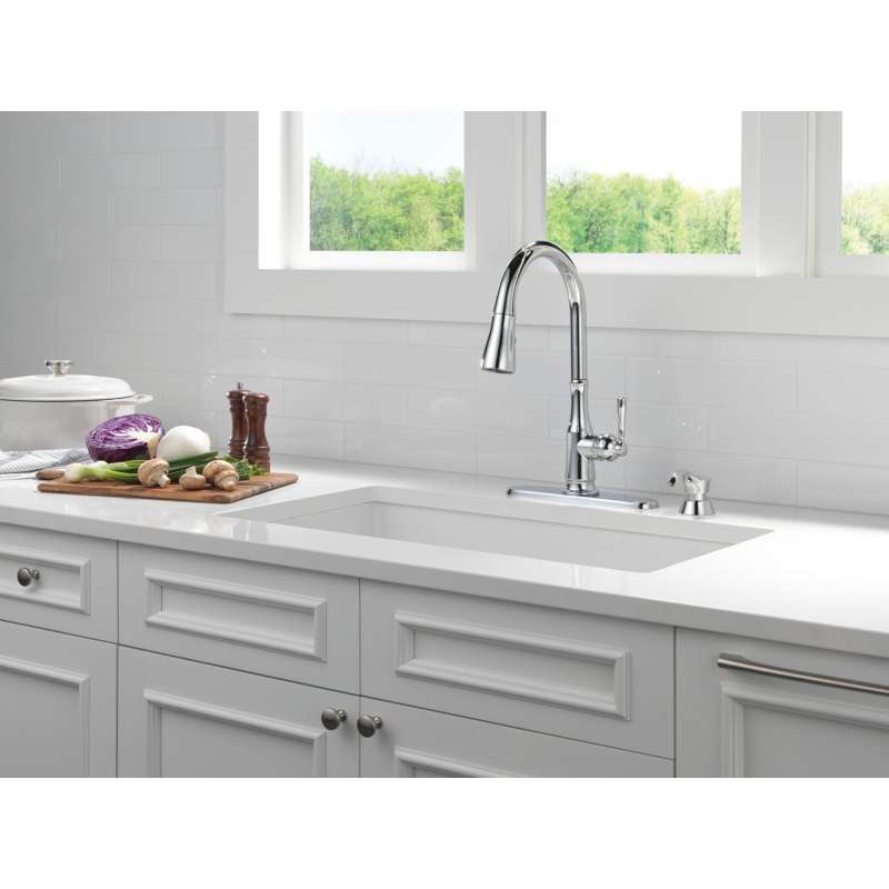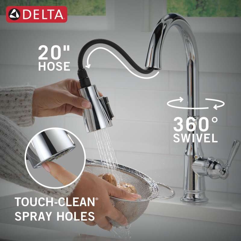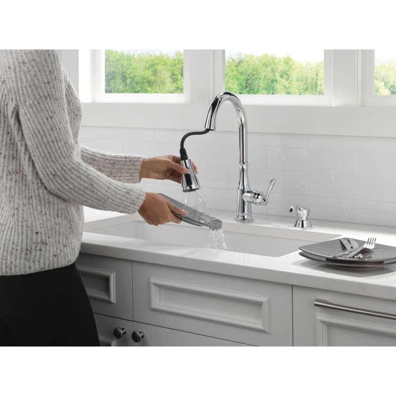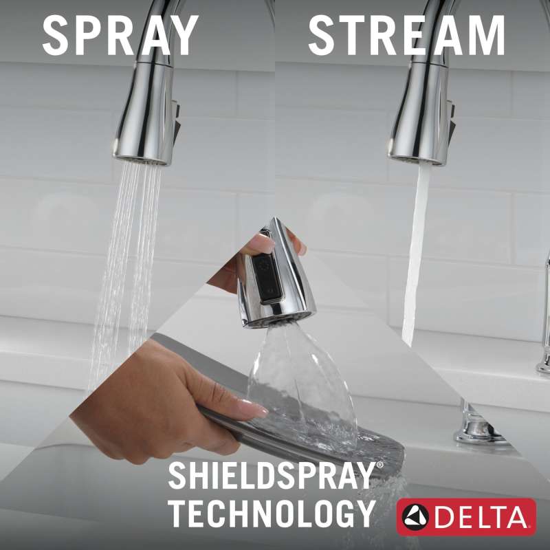 The capertee kitchen faucet brings clean lines and dimensional detail to your kitchen. Magnatite docking uses a powerful integrated magnet to set your pull down sprayer precisely into place and hold it there so it stays docked when not in use. Shieldspray technology uses a concentrated jet to power away stubborn messes while an innovative shield of water contains splatter and clears off the mess, so you can spend less time soaking, scrubbing and shirt swapping. Delta kitchen faucets with diamond seal technology perform like new for life with a patented design which reduces leak points, is less hassle to install and lasts twice as long as the industry standard. You can install with confidence, knowing that delta faucets are backed by our lifetime limited warranty.
