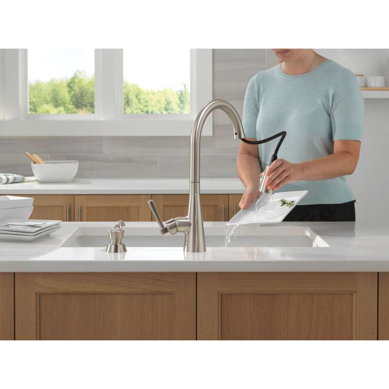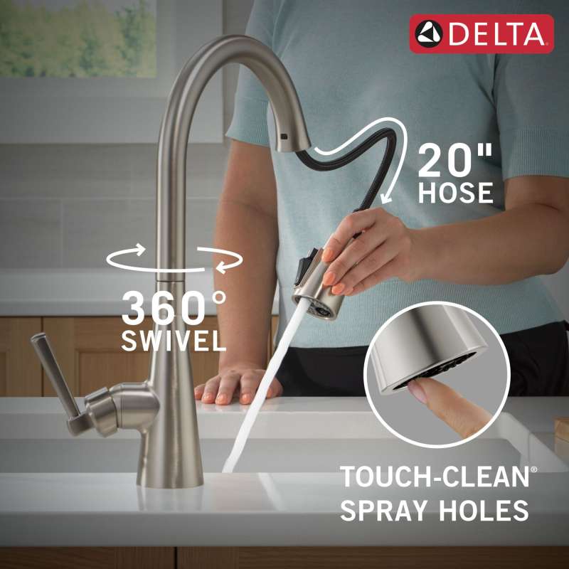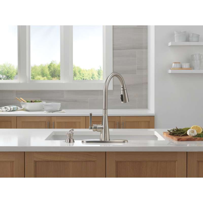 The boyd kitchen faucet features simple, elegant details to match any kitchen space. Magnatite docking uses a powerful integrated magnet to set your pull down sprayer precisely into place and hold it there so it stays docked when not in use. Shieldspray technology cleans with laser-like precision while containing mess and splatter. A concentrated jet powers away stubborn messes while an innovative shield of water contains splatter and clears off the mess, so you can spend less time soaking, scrubbing and shirt swapping. Spotshield finish helps to keep your kitchen faucet cleaner, longer by resisting water spots and fingerprints. Delta kitchen faucets with diamond seal technology perform like new for life with a patented design which reduces leak points, is less hassle to install and lasts twice as long as the industry standard. You can install with confidence, knowing that delta kitchen faucets are backed by our lifetime limited warranty.
