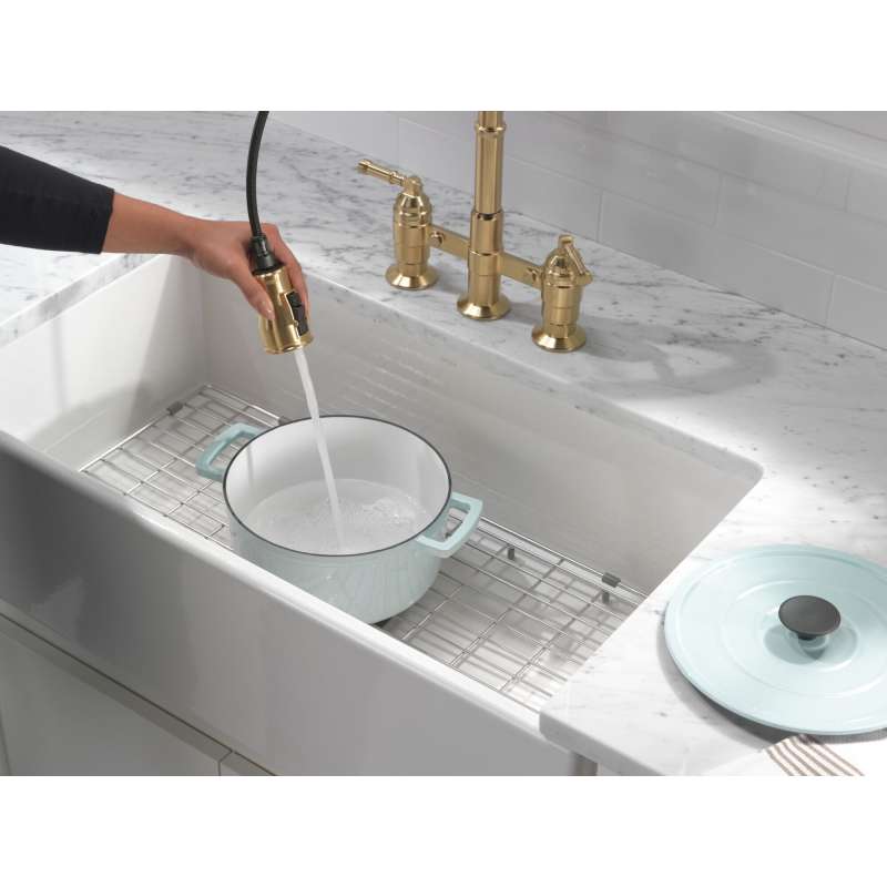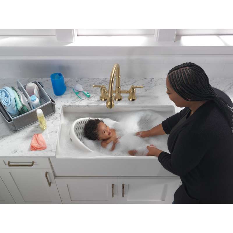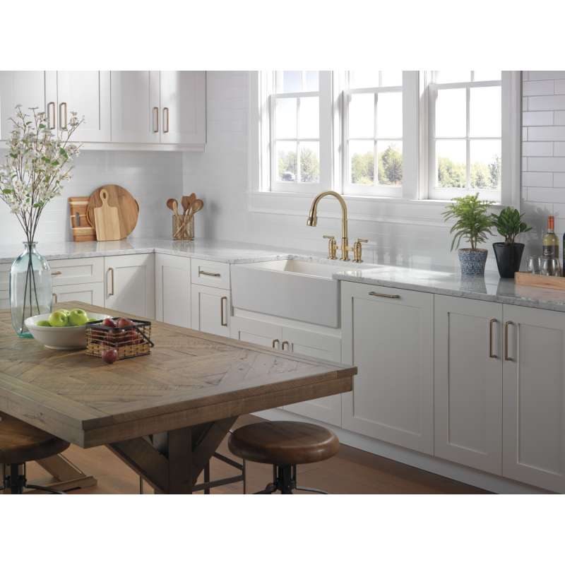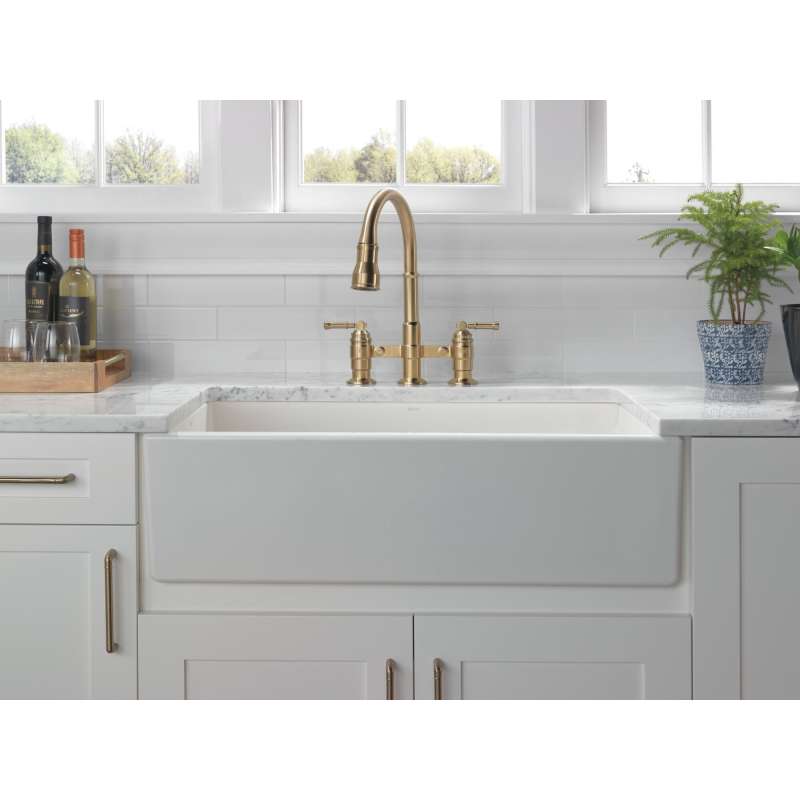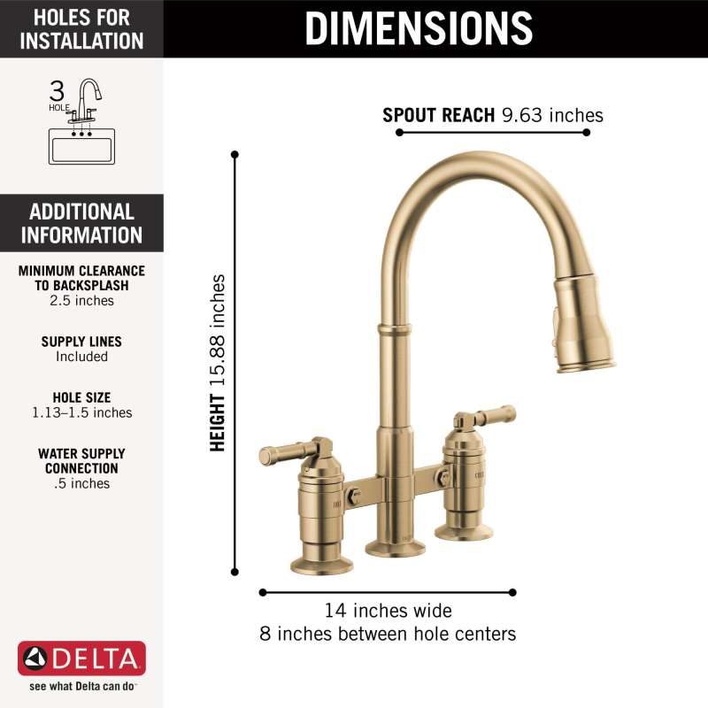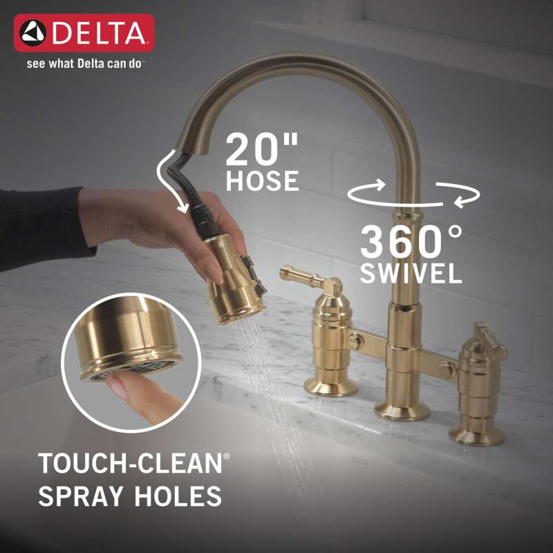 The powerful features of the broderick collection take center stage in the kitchen, with an industrial style that alludes to a rich heritage. The collection includes distinctive bridge faucet and pull-down spring spout faucet options that add a unique element to any kitchen. Styled after the rugged nuts and bolts of machinery, it serves as a true centerpiece in the kitchen. Kitchen sink faucets with touch-clean spray holes allow you to easily wipe away calcium and lime build-up with the touch of a finger. Delta shieldspray technology cleans with laser-like precision while containing mess and splatter. A concentrated jet powers away stubborn messes while an innovative shield of water contains splatter and clears off the mess, so you can spend less time soaking, scrubbing and shirt swapping. Delta kitchen faucets with diamond seal technology perform like new for life with a patented design which reduces leak points, is less hassle to install and lasts twice as long as the industry standard. Kitchen sink faucets with touch-clean spray holes allow you to easily wipe away calcium and lime build-up with the touch of a finger. You can install with confidence, knowing that delta kitchen faucets are backed by our lifetime limited warranty. Industry standard is based on asme a112.18.1 of 500,000 cycles.
