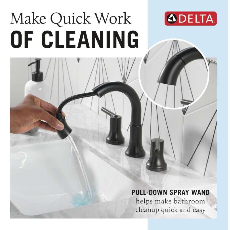 Inspired by the sleek elegance of modern european design, the trinsic bath collection completes the look of any contemporary bath. The pull-down spray wand features delta magnatite docking which uses a powerful integrated magnet to pull your faucet spray wand precisely into place and hold it there so it stays docked when not in use. The worry-free drain catch is a simple solution to the common problem of pills, jewelry or other valuables washing down the drain. Delta faucets with diamond seal technology perform like new for life with a patented design that reduces leak points, is less hassle to install and lasts twice as long as the industry standard. Delta watersense labeled faucets use at least 20% less water than the industry standard — helping you save water without compromising performance. You can install with confidence, knowing that delta faucets are backed by our lifetime limited warranty.