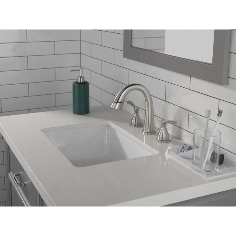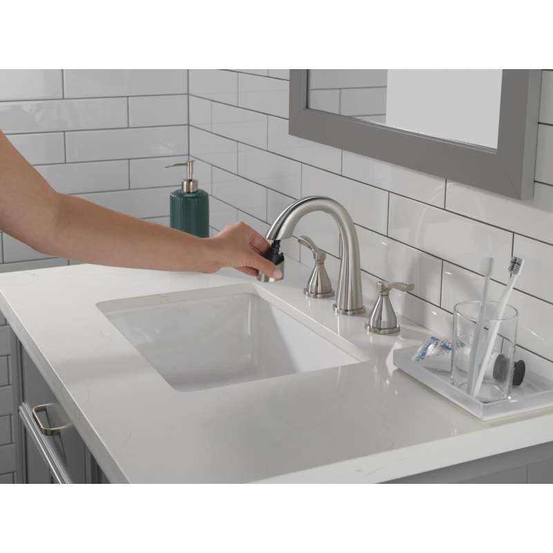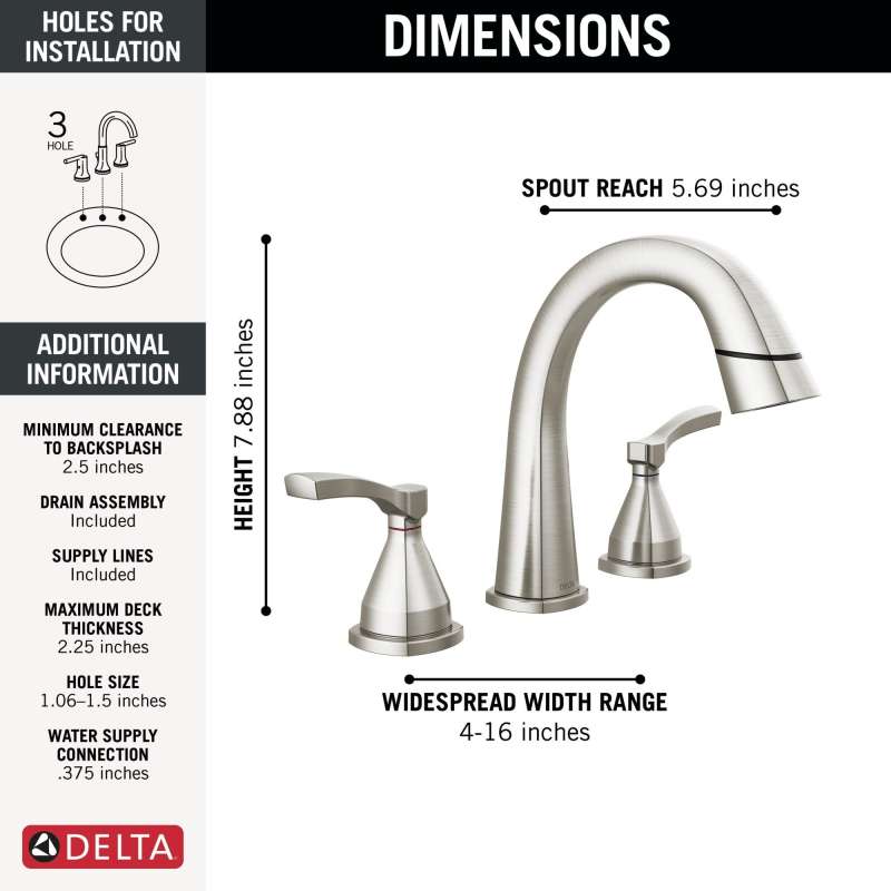 With subtly upturned spout and handles, the stryke bath collection radiates confidence and composure with an assured stature and ascending contours. The pull-down spray wand features delta magnatite docking which uses a powerful integrated magnet to pull your faucet spray wand precisely into place and hold it there so it stays docked when not in use. The worry-free drain catch is a simple solution to the common problem of pills, jewelry or other valuables washing down the drain. Delta lumicoat finishes are guaranteed to resist water spots and mineral buildup and easily wipe clean without chemicals or cleaners. Delta faucets with diamond seal technology perform like new for life with a patented design that reduces leak points, is less hassle to install and lasts twice as long as the industry standard. Delta watersense labeled faucets use at least 20% less water than the industry standard — helping you save water without compromising performance. You can install with confidence, knowing that delta faucets are backed by our lifetime limited warranty.