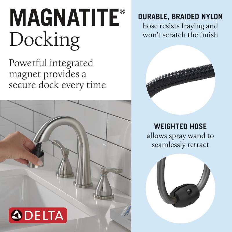 • Magnatite docking uses a powerful integrated magnet to snap your faucet spray wand precisely into place keeping it docked when not in use.