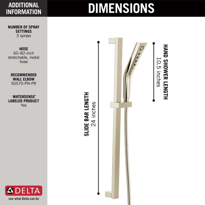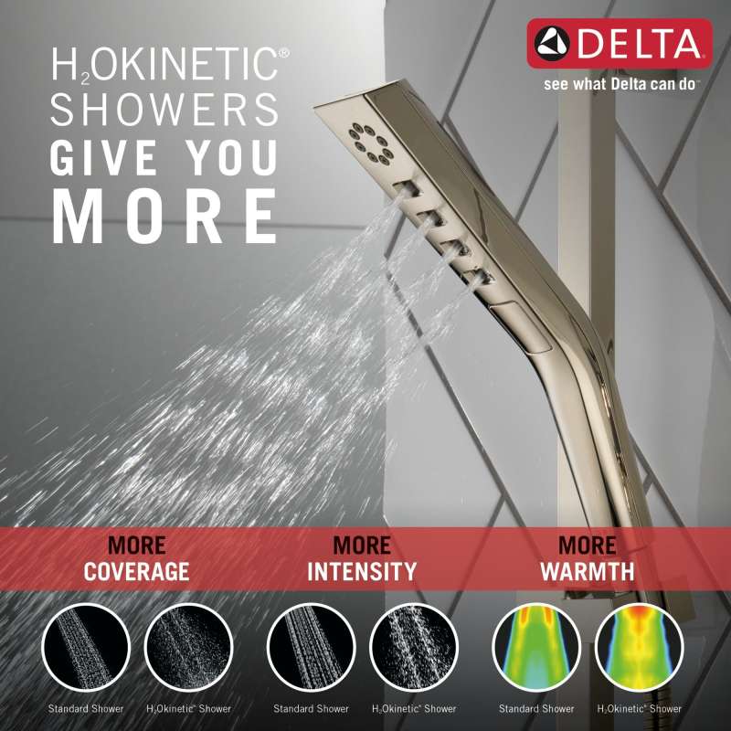Experience a better shower with the control and flexibility of a Delta hand shower. Great for showering yourself or your loved ones and pets, as well as for keeping your shower and tub clean. Our H2Okinetic Showers with PowerDrench Spray look different because they are different. H2Okinetic showers are powered by an innovative technology that sculpts the water into a unique wave pattern, giving you the feeling of more water and water pressure. Delta WaterSense labeled faucets, showers and toilets use at least 20% less water than the industry standard — helping you save water without compromising performance. You can install with confidence, knowing that Delta showers are backed by our Lifetime Limited Warranty.