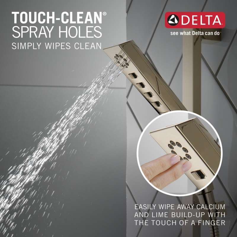 - Soft, rubber Touch-Clean spray holes allow you to easily wipe away calcium and lime build-up from the spray face of your shower head and hand shower with the touch of a finger