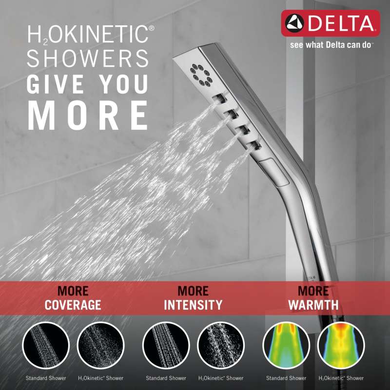 Experience a better shower with the control and flexibility of a Delta hand shower. Great for showering yourself or your loved ones and pets, as well as for keeping your shower and tub clean. Our H2Okinetic Showers with PowerDrench Spray look different because they are different. H2Okinetic showers are powered by an innovative technology that sculpts the water into a unique wave pattern, giving you the feeling of more water and water pressure. Delta WaterSense labeled faucets, showers and toilets use at least 20% less water than the industry standard — helping you save water without compromising performance. You can install with confidence, knowing that Delta showers are backed by our Lifetime Limited Warranty.