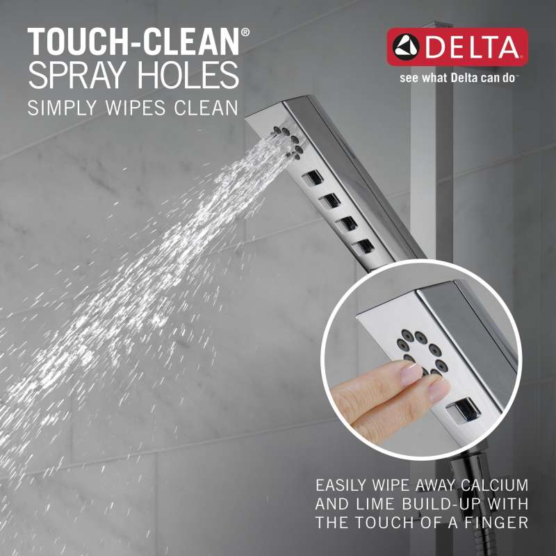 - Soft, rubber Touch-Clean spray holes allow you to easily wipe away calcium and lime build-up from the spray face of your shower head and hand shower with the touch of a finger