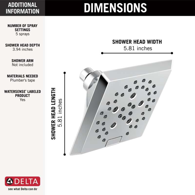 Replacing your shower head is one of the quickest, simplest upgrades you can make to your shower. Our shower heads feature a wide range of styles and innovations, and can be installed without special tools. All you need is standard plumber’s tape, making it an easy DIY project. Delta H2Okinetic Showers with PowerDrench Spray look different because they are different. H2Okinetic showers are powered by an innovative technology that sculpts the water into a unique wave pattern, giving you the feeling of more water and water pressure. Delta WaterSense labeled faucets, showers and toilets use at least 20% less water than the industry standard — helping you save water without compromising performance. You can install with confidence, knowing that Delta showers are backed by our Lifetime Limited Warranty.