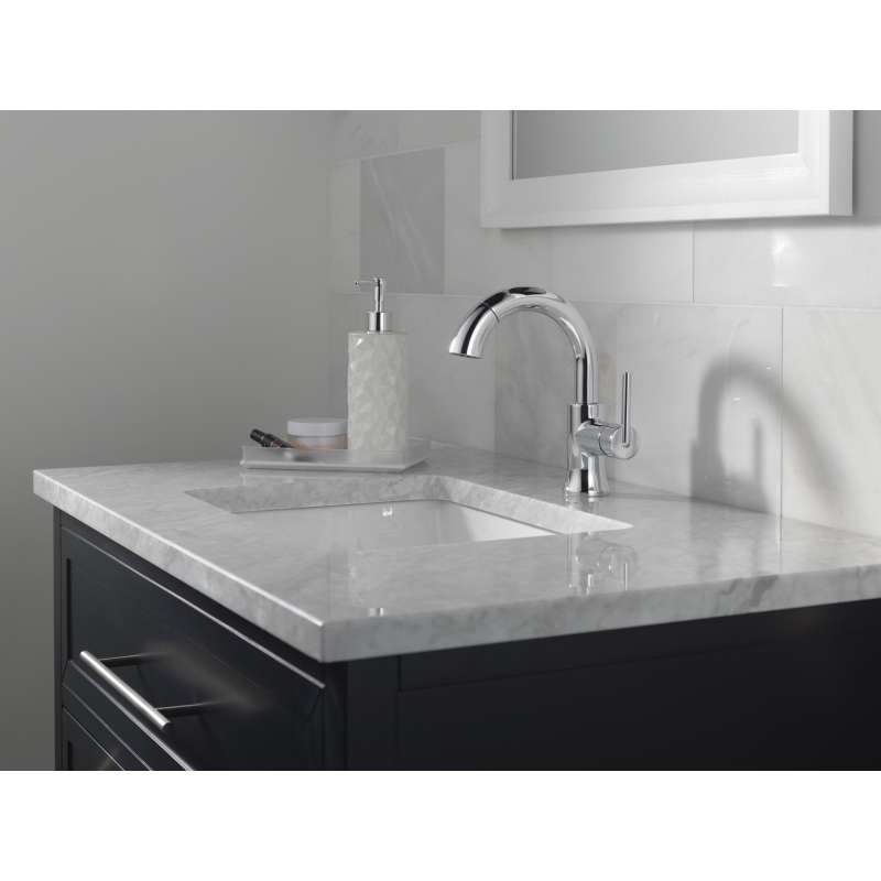 Inspired by the sleek elegance of modern european design, the trinsic bath collection completes the look of any contemporary bath. The pull-down spray wand features delta magnatite docking which uses a powerful integrated magnet to pull your faucet spray wand precisely into place and hold it there so it stays docked when not in use. The worry-free drain catch is a simple solution to the common problem of pills, jewelry or other valuables washing down the drain. Delta faucets with diamond seal technology perform like new for life with a patented design that reduces leak points, is less hassle to install and lasts twice as long as the industry standard. Delta watersense labeled faucets use at least 20% less water than the industry standard — helping you save water without compromising performance. You can install with confidence, knowing that delta faucets are backed by our lifetime limited warranty.