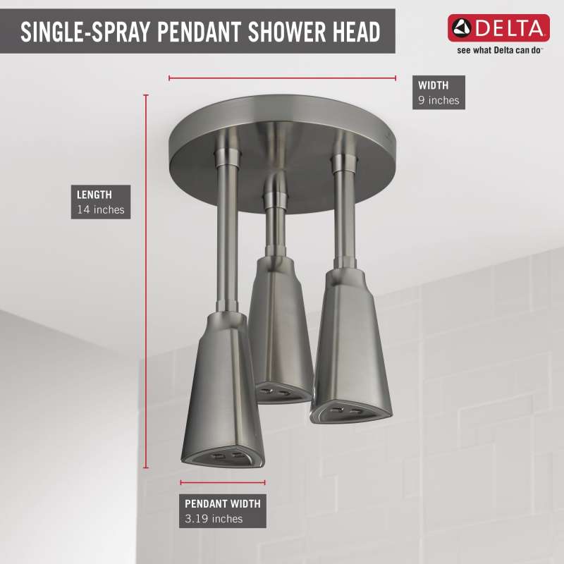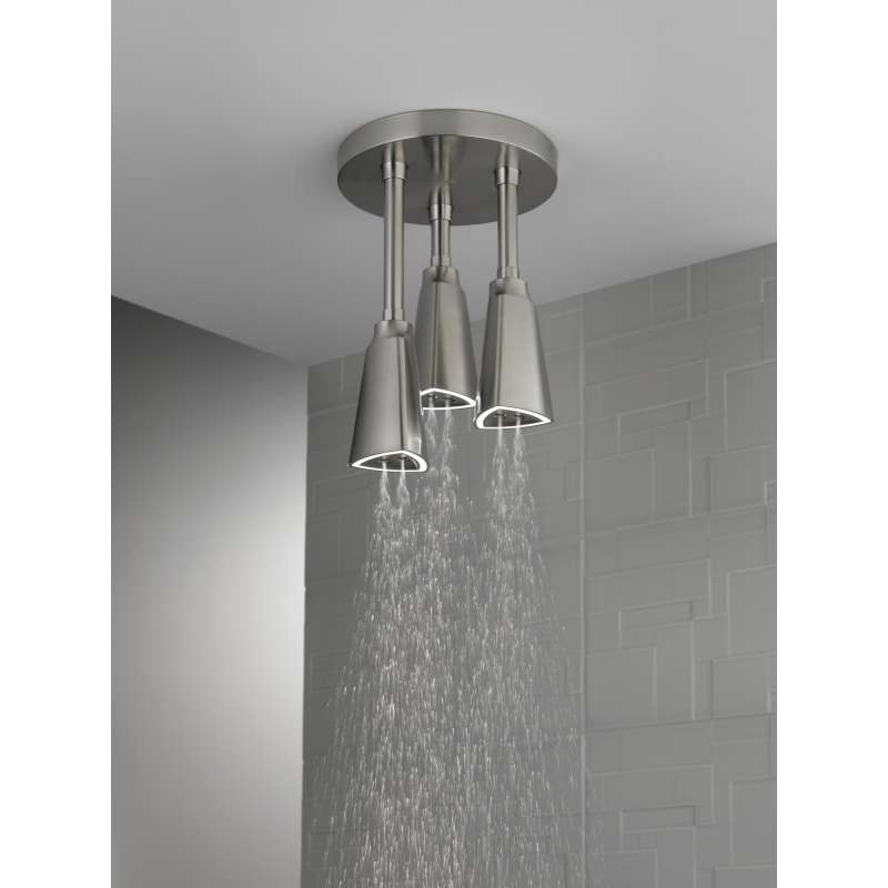 The centerpiece of any shower, Delta LED Pendant Raincan Shower Heads establish distinctive appeal in your space, blending cultivated designs with modern technologies. The tranquil illumination of the water-powered LED accent lights combines with H2Okinetic Technology for a soothing experience that transports you from shower to spa. The LED lights automatically turn on when water is running and turn off when water flow stops. The accent lights emit a subtle glow to provide soothing ambience, as opposed to serving as a bright, primary light source. Delta H2Okinetic Showers look different because they are different. Using advanced technology, H2Okinetic showers sculpt water into a unique pattern, giving you 3X the coverage of a standard shower head.* The end result is a shower that provides more coverage, more warmth and more intensity for a truly drenching shower experience. So go ahead and indulge, because now you can enjoy the feeling of more water without using more water. *Coverage measured in accordance with EPA WaterSense Specification for shower heads, March 4, 2010.