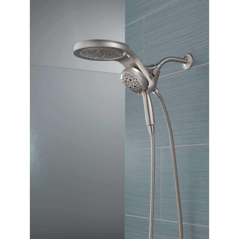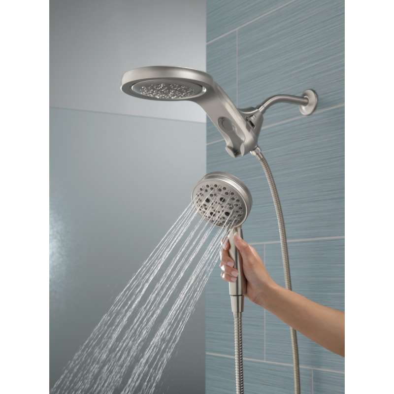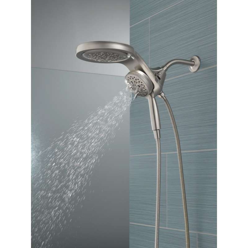 A Delta HydroRain H2Okinetic Two-in-One Shower Head with hand shower completely transforms your shower with dual shower head functionality, featuring an integrated raincan and hand shower. The power of the raincan and hand shower together creates an immersive, spa-like showering experience that you can install in minutes to a standard shower arm, without altering the plumbing behind the wall. The integrated hand shower stays put every time you dock thanks to MagnaTite Docking and provides maximum flexibility and control when you need it. You can install with confidence, knowing that Delta showers are backed by our Lifetime Limited Warranty.