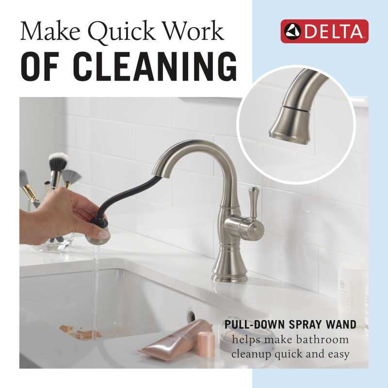 Featuring clean lines with elegant design details, the cassidy collection is an obvious choice for a timeless, traditionally styled bath. The pull-down spray wand features delta magnatite docking which uses a powerful integrated magnet to pull your faucet spray wand precisely into place and hold it there so it stays docked when not in use. The worry-free drain catch is a simple solution to the common problem of pills, jewelry or other valuables washing down the drain. Delta faucets with diamond seal technology perform like new for life with a patented design that reduces leak points, is less hassle to install and lasts twice as long as the industry standard. Delta watersense labeled faucets use at least 20% less water than the industry standard — helping you save water without compromising performance. You can install with confidence, knowing that delta faucets are backed by our lifetime limited warranty.