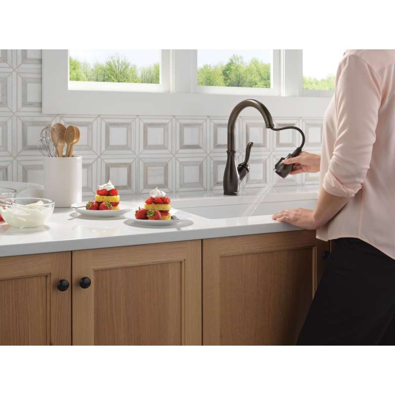 Traditional styling and modern functionality come together for a timeless look with the leland kitchen collection. Life moves fast, touchless technology keeps up. Delta touch2o faucets with touchless technology help keep germs and mess off your kitchen faucet and provides easy water control 3 ways: simply place your hand near the faucet, tap the faucet surface, or use standard handle activation. Delta voiceiq technology pairs with your connected home device to give you exactly the amount of water you need with features like metered dispensing and custom container commands. Simply ask your faucet to dispense one cup, six ounces, a gallon or just about any other amount you could need. The tempsense led light changes color to alert you to the water’s temperature and eliminate any possible surprises or discomfort. Shieldspray technology cleans with laser-like precision while containing mess and splatter. A concentrated jet powers away stubborn messes while an innovative shield of water contains splatter and clears off the mess, so you can spend less time soaking, scrubbing and shirt swapping. Delta faucets with diamond seal technology perform like new for life with a patented design which reduces leak points, is less hassle to install and lasts twice as long as the industry standard. You can install with confidence, knowing that delta faucets are backed by our lifetime limited warranty.