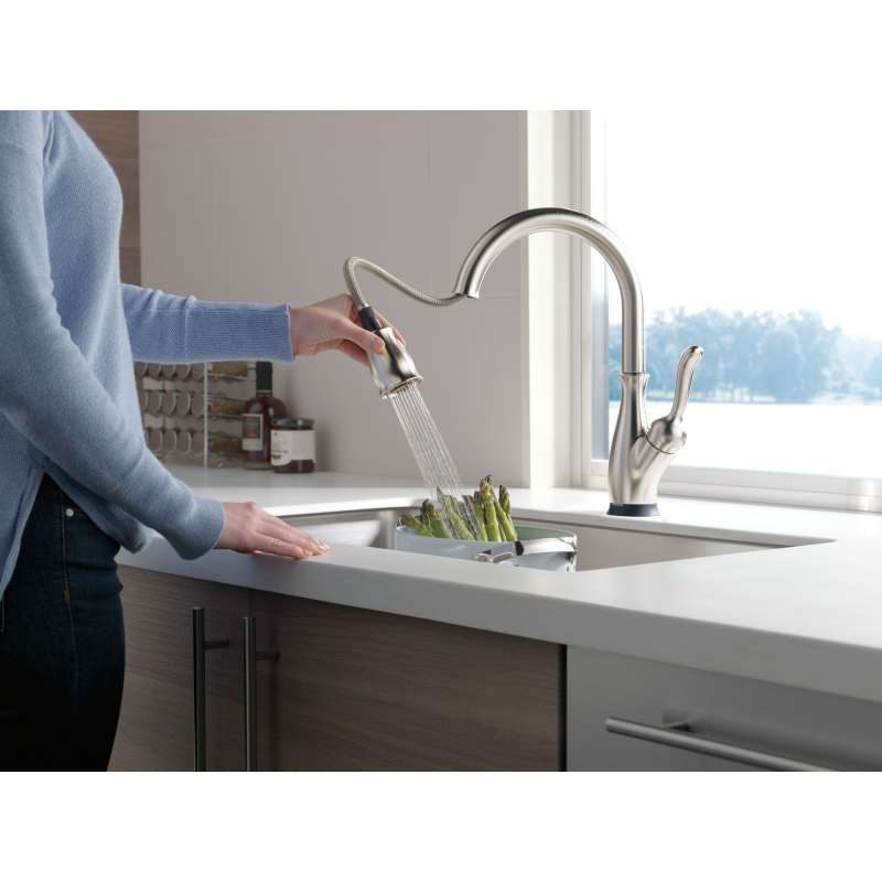 Delta voiceiq technology pairs with your connected home device to give you exactly the amount of water you need with features like metered dispensing and custom container commands. Simply ask your faucet to dispense one cup, six ounces, a gallon or just about any other amount you could need. Custom container commands make everyday tasks easier, like filling a coffee pot or dog bowl, while thoughtful features like water warm-up and voice-activated on/off lend a hand when yours are full. Take command of your kitchen with a voiceiq faucet: a revolutionary kitchen faucet that thinks on demand. This leland pull-down kitchen faucet is packed with functional features, like delta touch2o technology. A simple touch anywhere on the spout or handle with your wrist or forearm activates the flow of water at the temperature where your handle is set. The delta tempsense led light changes color to alert you to the water’s temperature and eliminates any possible surprises or discomfort. Kitchen sink faucets with touch-clean spray holes allow you to easily wipe away calcium and lime build-up with the touch of a finger. Delta shieldspray technology cleans with laser-like precision while containing mess and splatter. A concentrated jet powers away stubborn messes while an innovative shield of water contains splatter and clears off the mess, so you can spend less time soaking, scrubbing and shirt swapping. Delta spotshield technology helps to keep your kitchen faucet cleaner, longer by resisting water spots and fingerprints. Keep your space spotless with spotshield technology, available across a variety of finishes for the kitchen and bath. Delta kitchen faucets with diamond seal technology perform like new for life with a patented design which reduces leak points, is less hassle to install and lasts twice as long as the industry standard. Kitchen sink faucets with touch-clean spray holes allow you to easily wipe away calcium and lime build-up with the touch of a finger. You can install with confidence, knowing that delta kitchen faucets are backed by our lifetime limited warranty. Electronic parts are backed by our 5-year electronic parts warranty. Industry standard is based on asme a112.18.1 of 500,000 cycles.