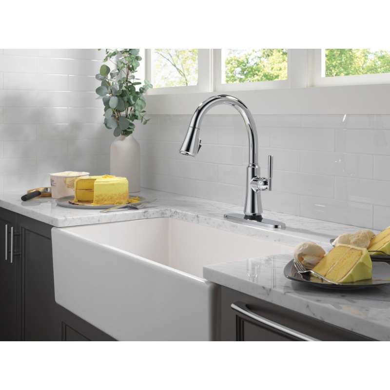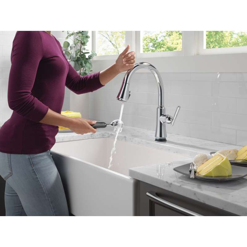 A contemporary take on traditional styling, the coranto kitchen collection brings everyday refinement to a space with subtle design details. Life moves fast, touchless technology keeps up. Delta touch2o faucets with touchless technology help keep germs and mess off your kitchen faucet and provides easy water control 3 ways: simply place your hand near the faucet, tap the faucet surface, or use standard handle activation. The tempsense led light changes color to alert you to the water’s temperature and eliminate any possible surprises or discomfort. Magnatite docking uses a powerful integrated magnet to pull your faucet spray wand precisely into place and hold it there so it stays docked when not in use. Shieldspray technology cleans with laser-like precision while containing mess and splatter. A concentrated jet powers away stubborn messes while an innovative shield of water contains splatter and clears off the mess, so you can spend less time soaking, scrubbing and shirt swapping. Delta faucets with diamond seal technology perform like new for life with a patented design which reduces leak points, is less hassle to install and lasts twice as long as the industry standard. You can install with confidence, knowing that delta faucets are backed by our lifetime limited warranty.
