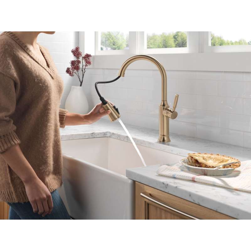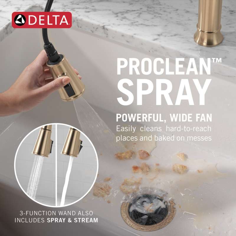 Command your kitchen with the symmetrical, statuesque design of the renaldi collection. The delta proclean kitchen spray provides a powerful, wide fan spray for quick and complete cleaning. Easily clean hard-to-reach places, help remove baked on messes and spray down your sink faster as the wide stream covers more surface area. Lumicoat finishes easily wipe clean without the need for cleaners or chemicals and are guaranteed to resist mineral buildup and hard water stains. The ultra-sleek surface repels liquids, resisting water spots and staying cleaner longer, so your faucet stays beautiful. Magnatite docking uses a powerful integrated magnet to set your pull down sprayer precisely into place and hold it there so it stays docked when not in use. You can install with confidence, knowing that delta kitchen faucets are backed by our lifetime limited warranty.