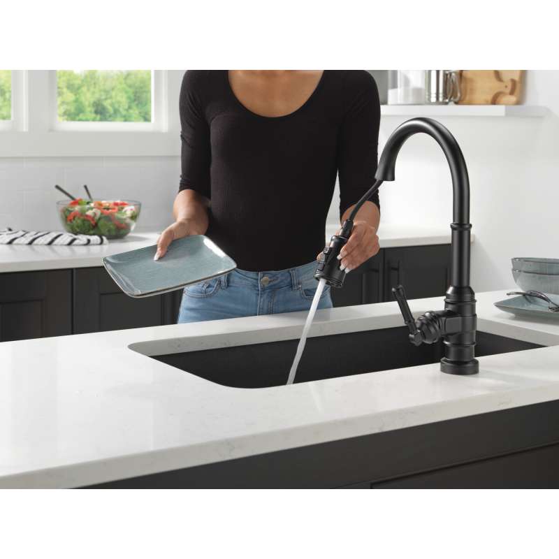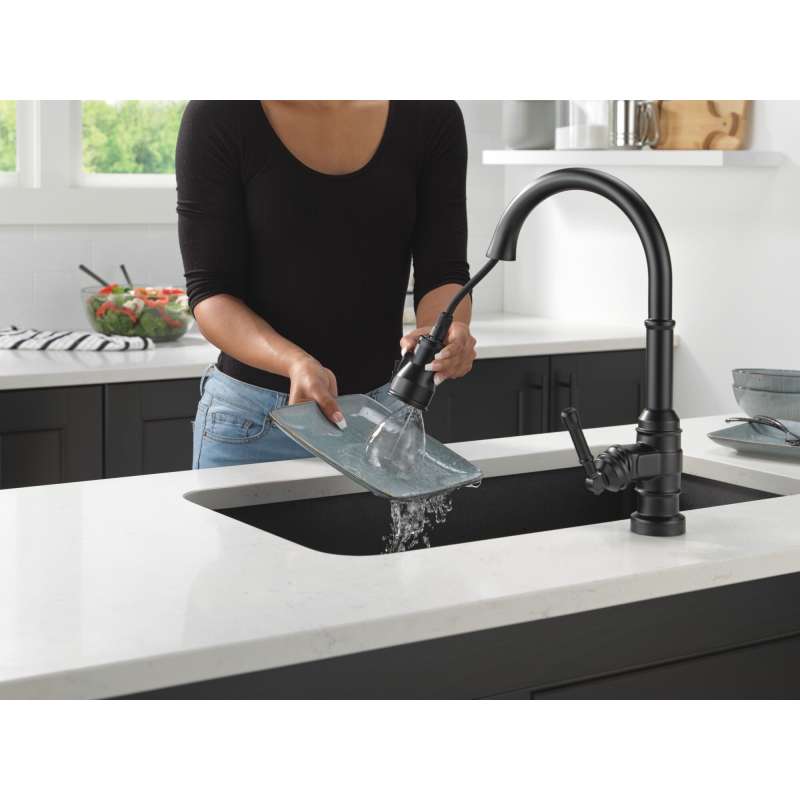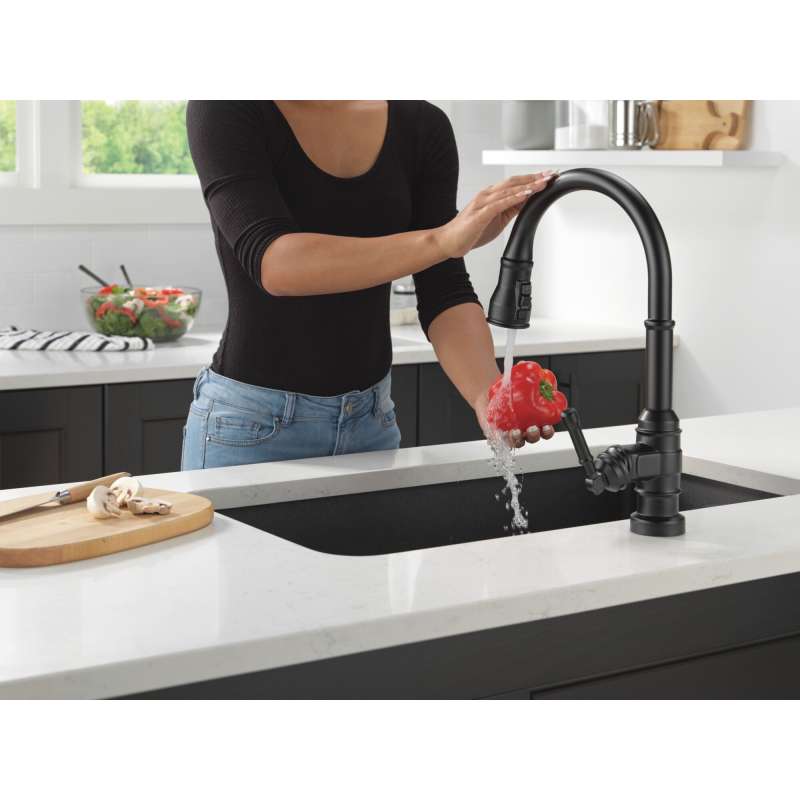 The powerful features of the broderick collection take center stage in the kitchen, with an industrial style that alludes to a rich heritage. The collection includes distinctive bridge faucet and pull-down spring spout faucet options that add a unique element to any kitchen. Styled after the rugged nuts and bolts of machinery, it serves as a true centerpiece in the kitchen. Touch it on. Touch it off. Whether you have two full hands or 10 messy fingers, delta touch2o technology helps keep your kitchen faucet clean, even when your hands aren’t. A simple touch anywhere on the spout or handle with your wrist or forearm activates the flow of water at the temperature where your handle is set. The delta tempsense led light changes color to alert you to the water’s temperature and eliminates any possible surprises or discomfort. Kitchen sink faucets with touch-clean spray holes allow you to easily wipe away calcium and lime build-up with the touch of a finger. Delta shieldspray technology cleans with laser-like precision while containing mess and splatter. A concentrated jet powers away stubborn messes while an innovative shield of water contains splatter and clears off the mess, so you can spend less time soaking, scrubbing and shirt swapping. Delta kitchen faucets with diamond seal technology perform like new for life with a patented design which reduces leak points, is less hassle to install and lasts twice as long as the industry standard. Kitchen sink faucets with touch-clean spray holes allow you to easily wipe away calcium and lime build-up with the touch of a finger. You can install with confidence, knowing that delta kitchen faucets are backed by our lifetime limited warranty. Electronic parts are backed by our 5-year electronic parts warranty. Industry standard is based on asme a112.18.1 of 500,000 cycles.