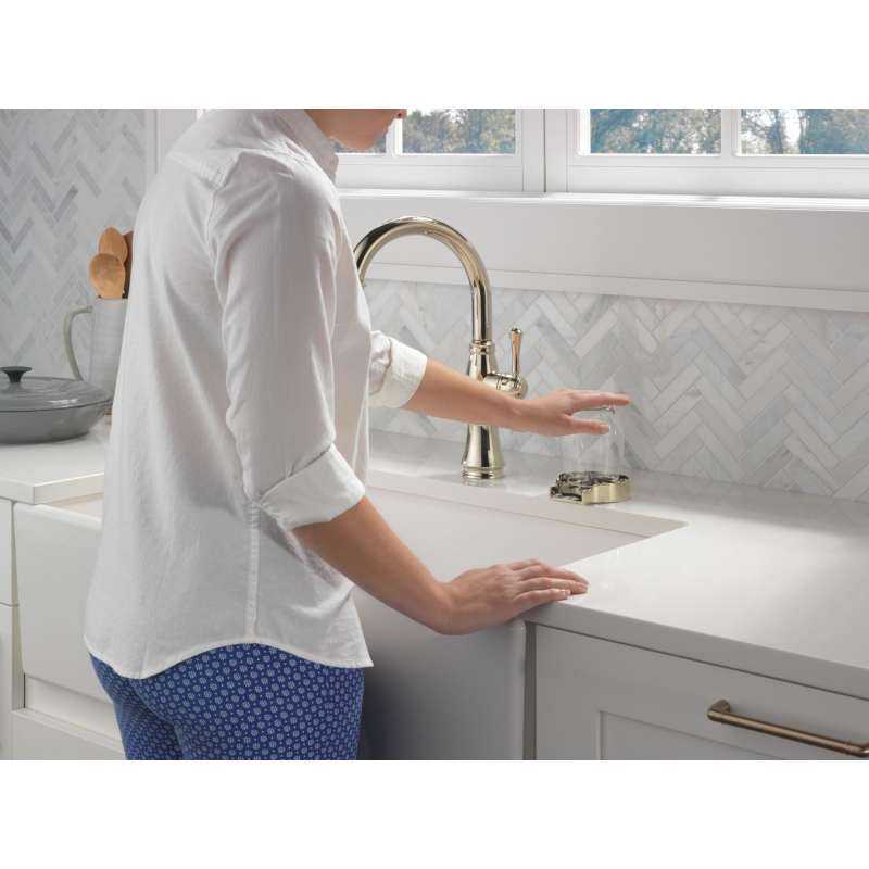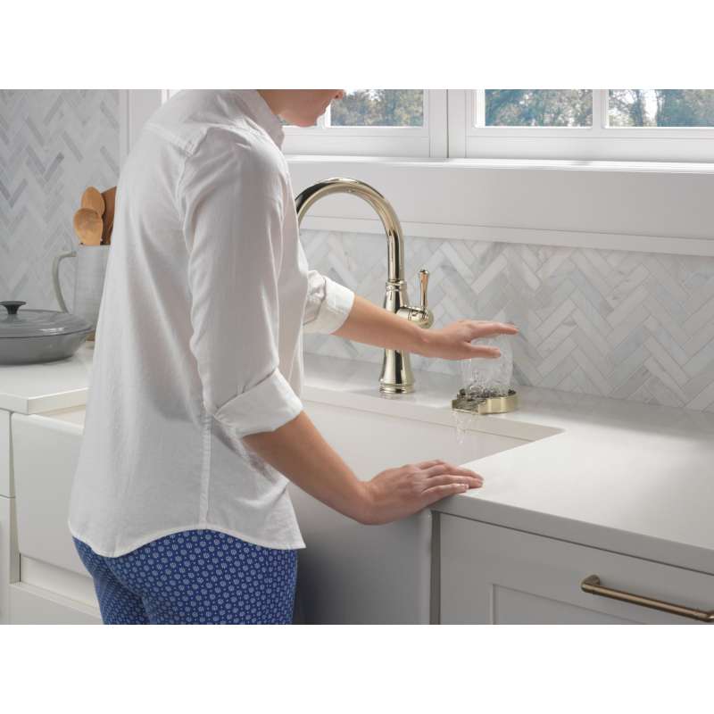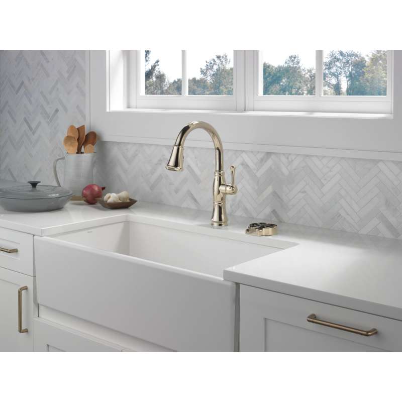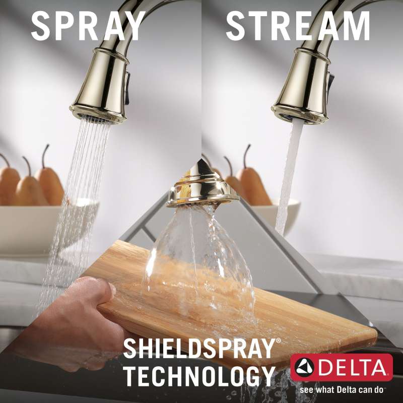 Kitchen sink faucets with touch-clean spray holes allow you to easily wipe away calcium and lime build-up with the touch of a finger. Delta shieldspray technology cleans with laser-like precision while containing mess and splatter. A concentrated jet powers away stubborn messes while an innovative shield of water contains splatter and clears off the mess, so you can spend less time soaking, scrubbing and shirt swapping. Delta lumicoat finishes are guaranteed to resist water spots and mineral buildup and easily wipe clean without the need for cleaners or chemicals. The ultra-sleek surface repels liquids, resisting water spots and staying cleaner longer, so your faucet stays beautiful. Delta kitchen faucets with diamond seal technology perform like new for life with a patented design which reduces leak points, is less hassle to install and lasts twice as long as the industry standard. Kitchen sink faucets with touch-clean spray holes allow you to easily wipe away calcium and lime build-up with the touch of a finger. You can install with confidence, knowing that delta faucets are backed by our lifetime limited warranty. Industry standard is based on asme a112.18.1 of 500,000 cycles.