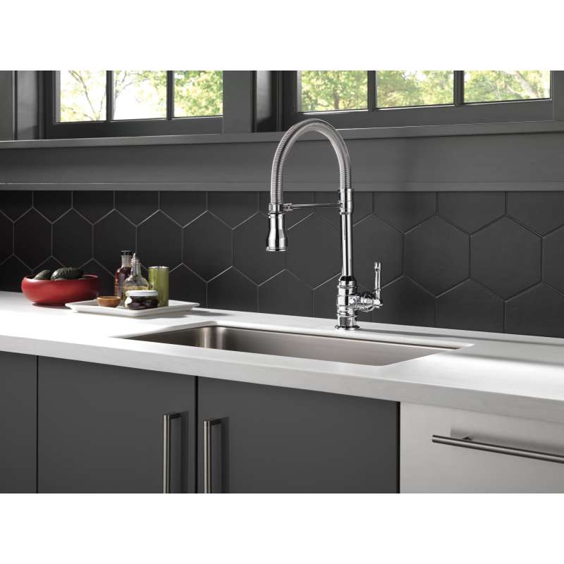 The powerful features of the broderick collection take center stage in the kitchen, with an industrial style that alludes to a rich heritage. The collection includes distinctive bridge faucet and pull-down spring spout faucet options that add a unique element to any kitchen. Styled after the rugged nuts and bolts of machinery, it serves as a true centerpiece in the kitchen. Take control of your kitchen with the flexible, spring-design undocking spout, which can be easily disconnected then magnetically re-docked for free range of motion. When docked, the broderick pro faucet still operates as a true pull-down faucet with magnatite docking. Kitchen sink faucets with touch-clean spray holes allow you to easily wipe away calcium and lime build-up with the touch of a finger. Delta shieldspray technology cleans with laser-like precision while containing mess and splatter. A concentrated jet powers away stubborn messes while an innovative shield of water contains splatter and clears off the mess, so you can spend less time soaking, scrubbing and shirt swapping. Delta kitchen faucets with diamond seal technology perform like new for life with a patented design which reduces leak points, is less hassle to install and lasts twice as long as the industry standard. Kitchen sink faucets with touch-clean spray holes allow you to easily wipe away calcium and lime build-up with the touch of a finger. You can install with confidence, knowing that delta kitchen faucets are backed by our lifetime limited warranty. Industry standard is based on asme a112.18.1 of 500,000 cycles.